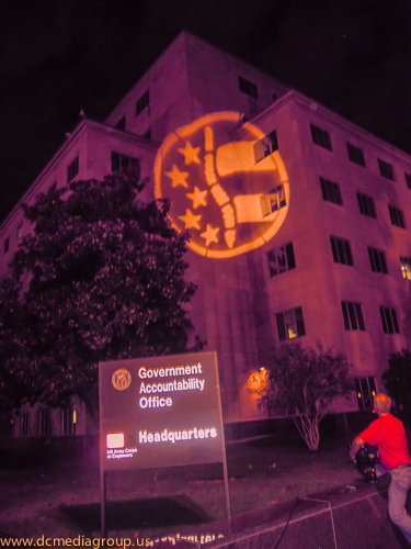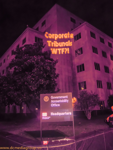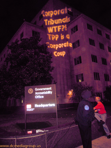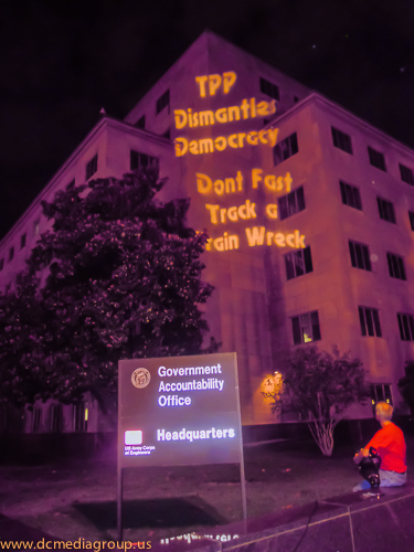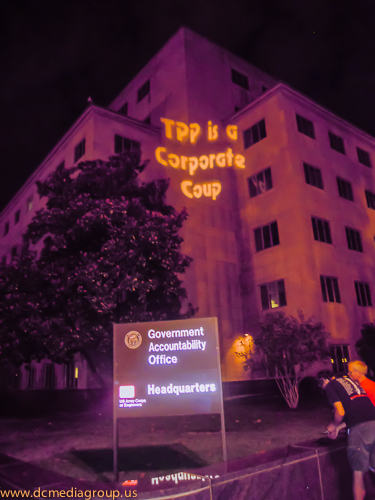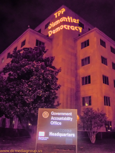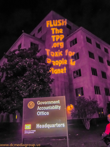 Part of a concerted effort to bring attention to the secretive negotiations of the Trans-Pacific Partnership, the campaign Flush the TPP projected slogans–including “TPP Dismantles Democracy” and “TPP is a Corporate Coup”–onto the General Accountability Office building in Washington, DC. The campaign has organized several days of actions to interrupt the fast-track negotiations which would ratify the Trans-Pacific Partnership. According to its website: