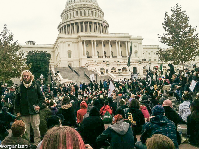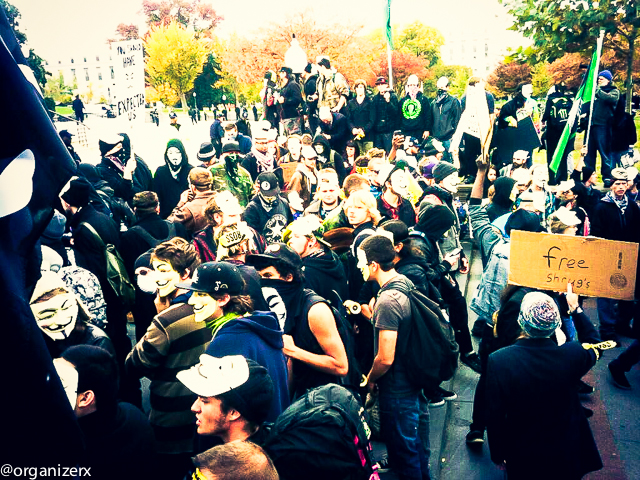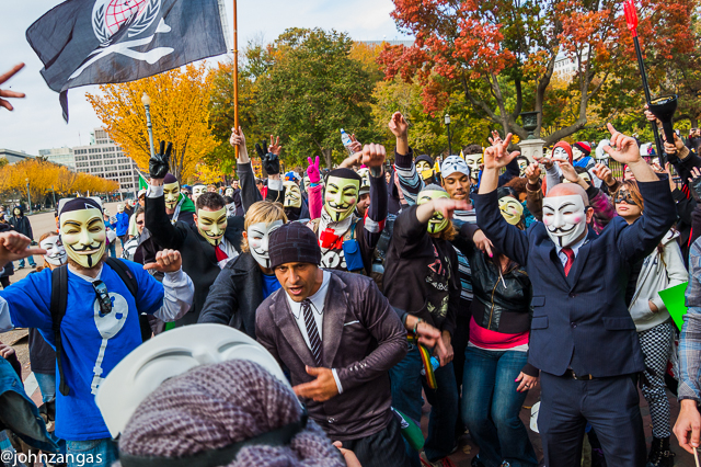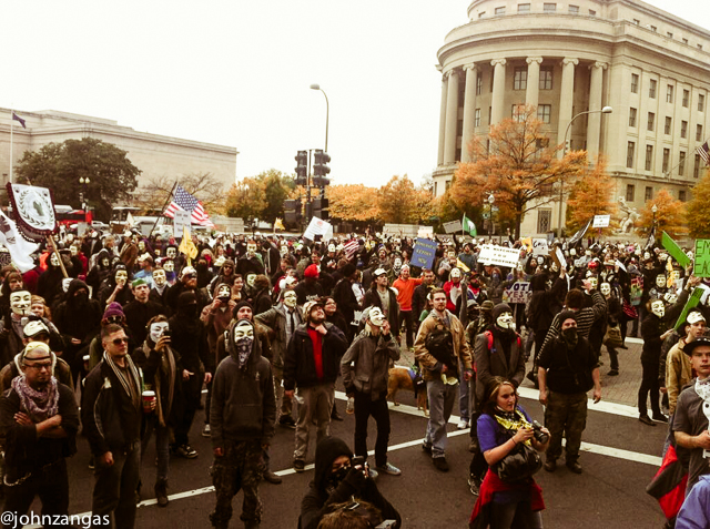 As many as a thousand people participated in the Million Mask March in Washington, DC on Tuesday, November 5. Wearing Guy Fawkes masks, they gathered at the Washington Monument in mid-morning to march to the White House. The majority then headed to the U.S. Capitol while smaller groups broke off and criss-crossed the city, visiting the Department of Justice and the offices of agricultural giant Monsanto, sometimes pausing to block intersections in downtown DC.