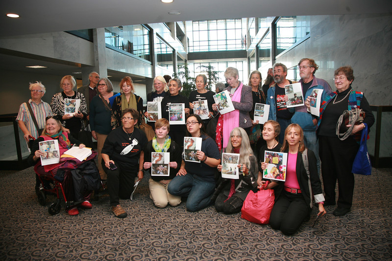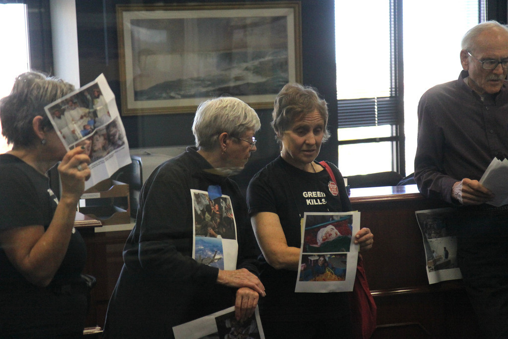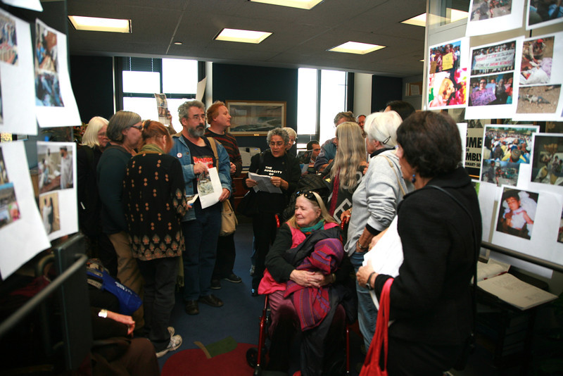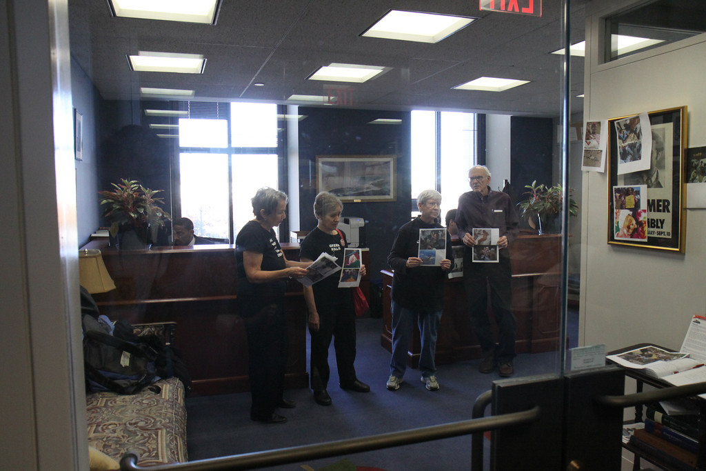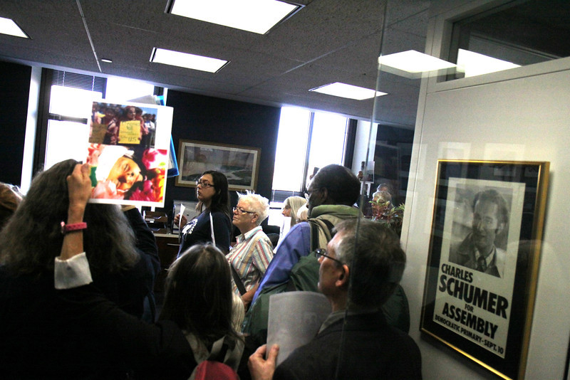 Anti-drone activists from around the country paid a visit to Senator Chuck Schumer’s office today to protest drone strikes in the Mideast, plastering pictures of drone victims on the office doors. They contend that unmanned aerial vehicles or drones kill innocent civilians and terrorize people living in targeted areas in Yemen, Somalia, Afghanistan and Pakistan. Four among the group were arrested for refusing to leave.