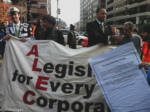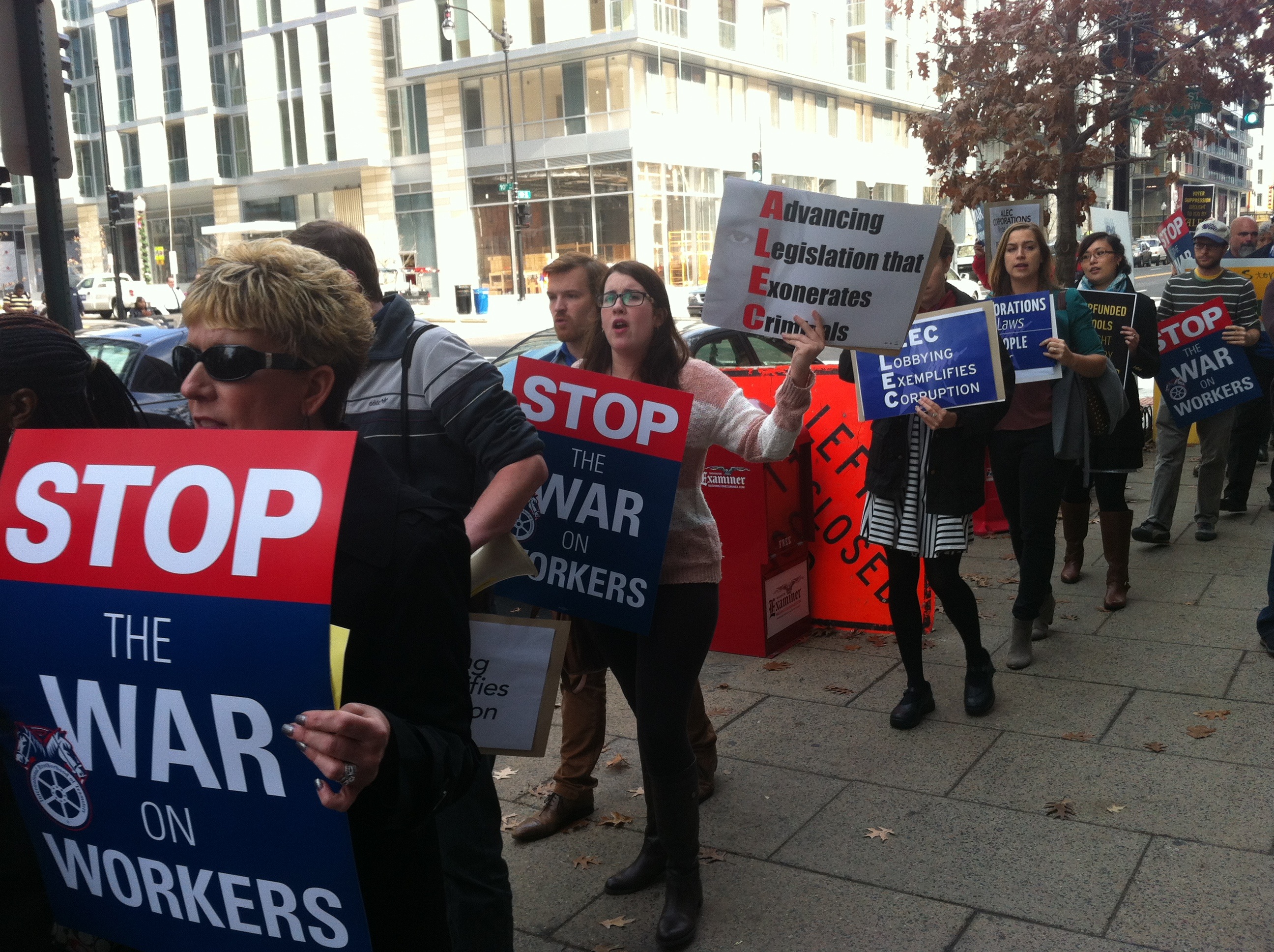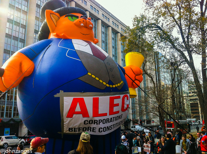 A giant inflatable “fat cat” labeled “ALEC” hovered above the protestors who represented unions, environmental groups, teachers, and healthcare workers as they marched from Franklin Park to the Hyatt Hotel on 10th St. in Northwest Washington.