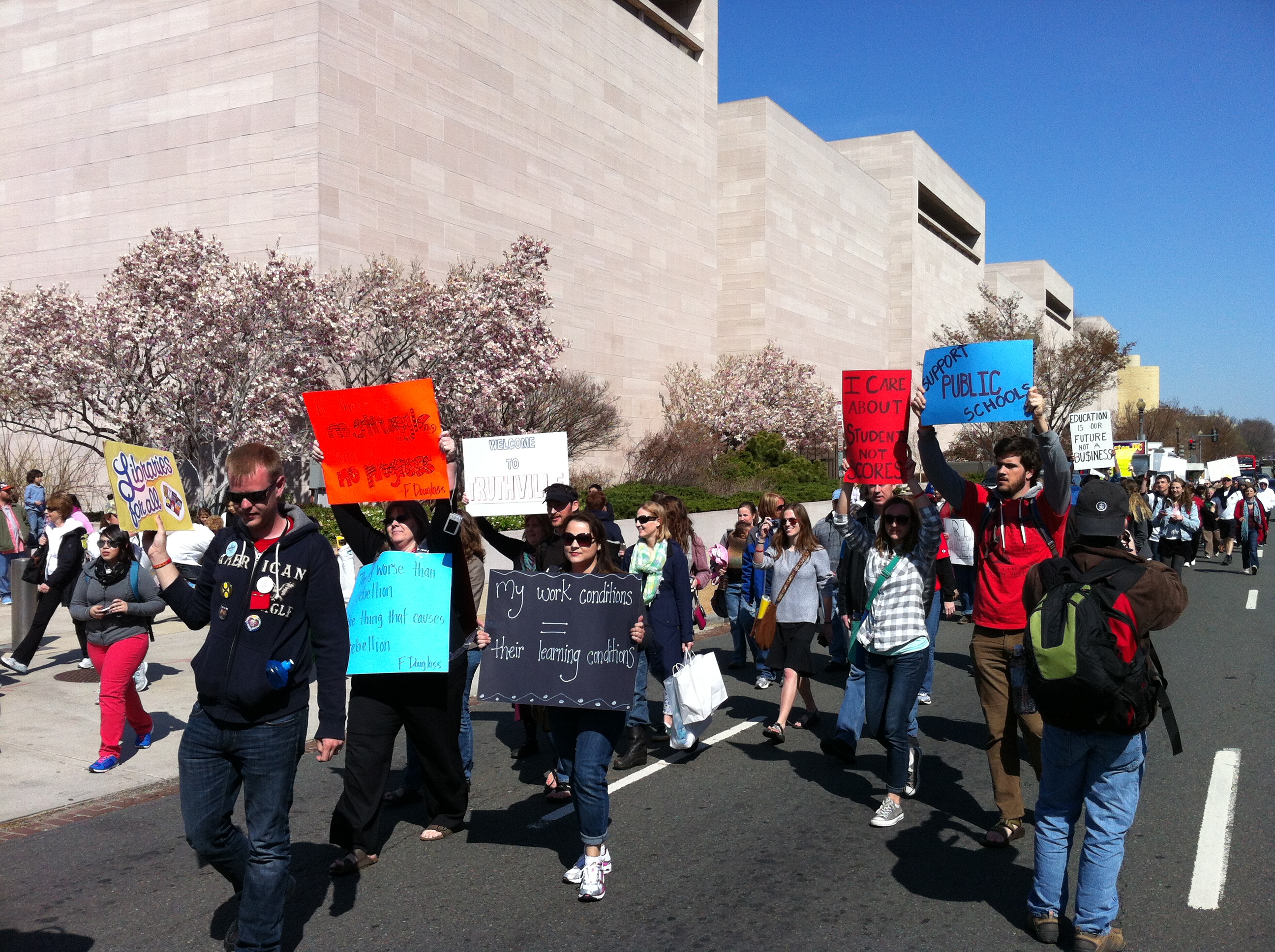 DC Media Group has been covering this issue. While it at first appears to be an outside-of-the-beltway issue, there is a single point of protest for this system gone awry, and that is the U.S. Department of Education. Rob Brune and John Zangas of DC Media Group covered an “occupation” of the Department of Education in 2013, and Rob and Gen Knoxx extensively, albeit remotely, covered school-closing protests in Chicago.