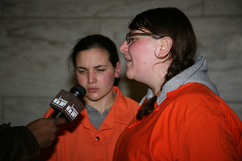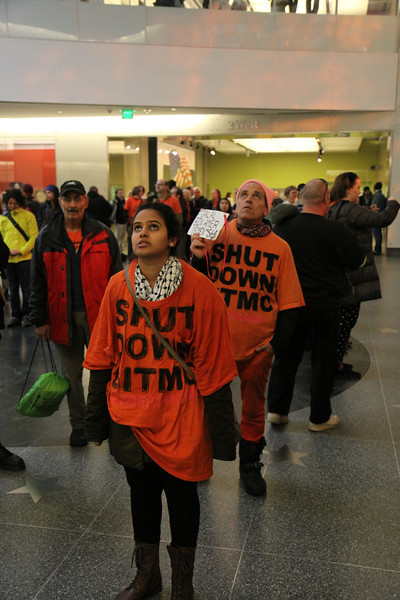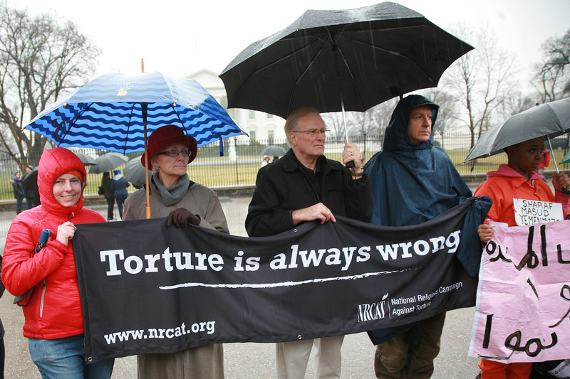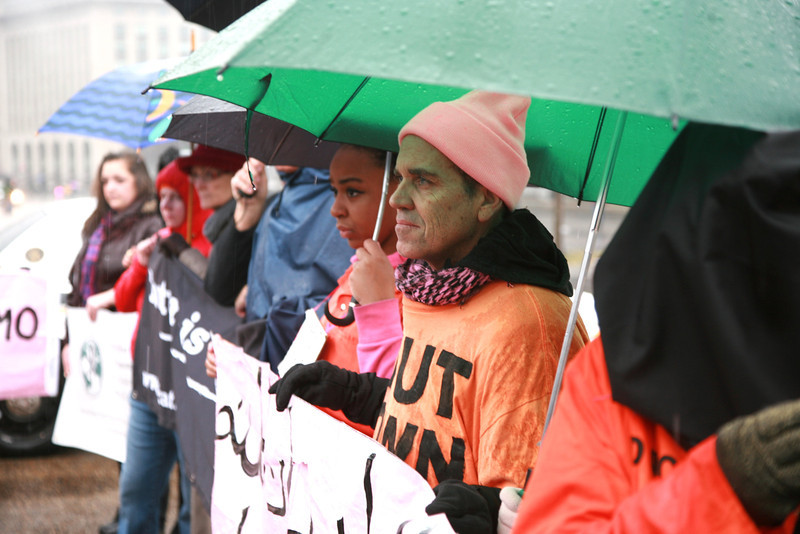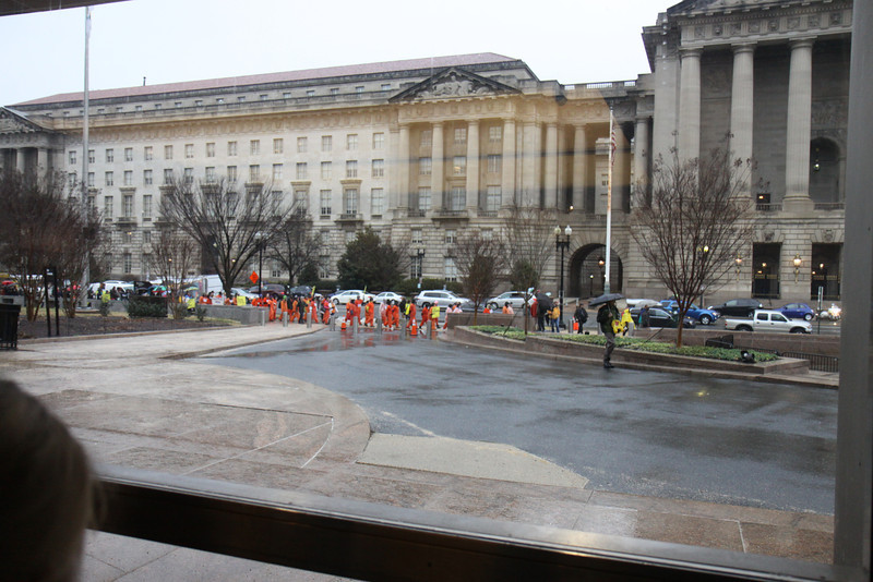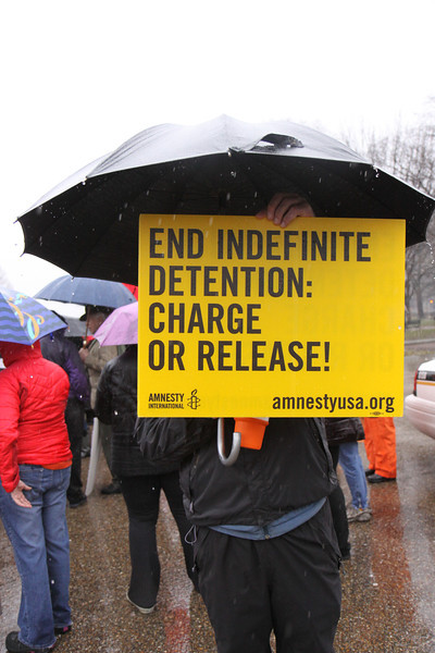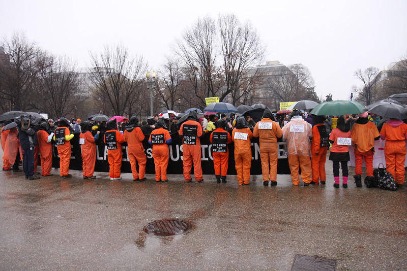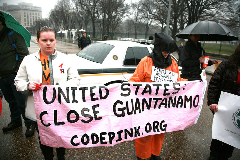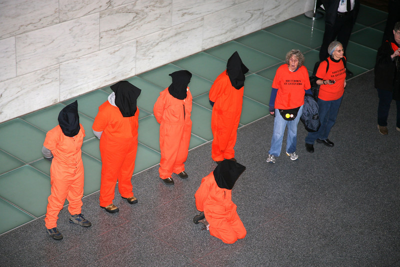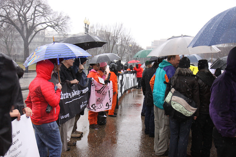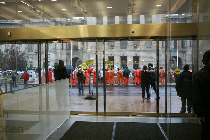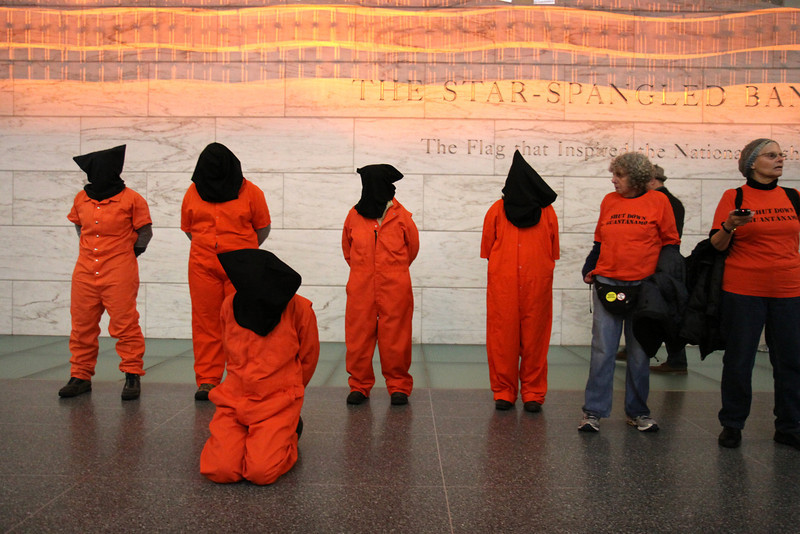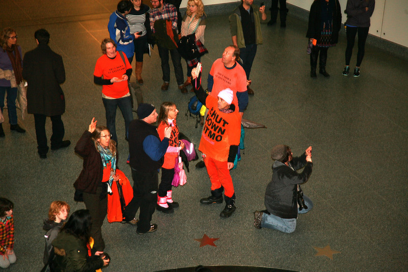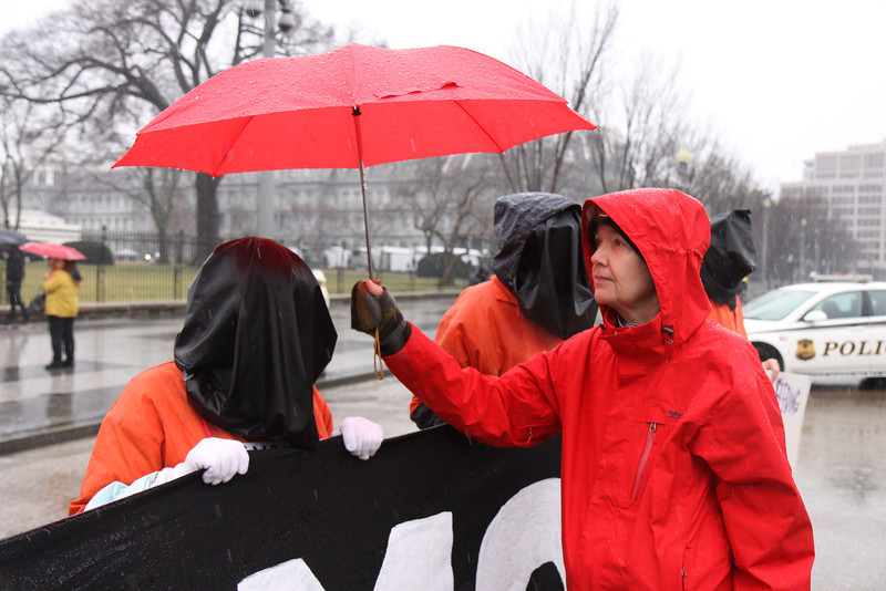 Several dozen protestors braved pouring rain to mark the twelfth anniversary of the opening of Guantánamo Prison. In front of the White House, they called on President Obama to use his executive powers to close the prison now. They then marched to the National Museum of American History and filled the second floor lobby, some of them dressed in orange jumpsuits and black hoods.