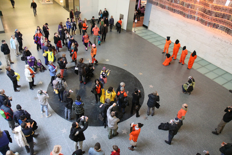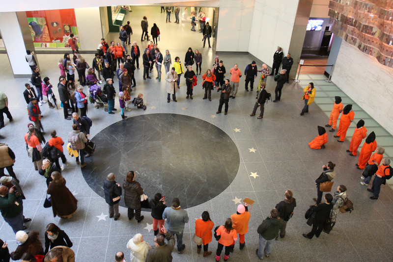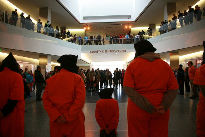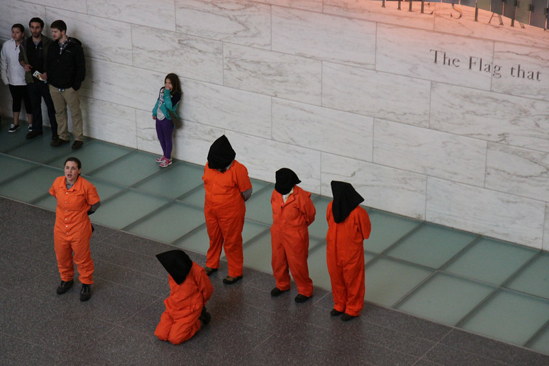 A line-up of people dressed in orange jumpsuits and black hoods represented Guantánamo prisoners. They called it a “new exhibit” for the museum.