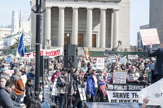 The occasion for the rally was a meeting of the Maryland Public Service Commission to begin its review of Dominion Resource’s application to build a 130-megawatt gas-fired liquefaction complex at Cove Point. Dominion has signed contracts with gas companies from Japan and India to export natural gas from Cove Point to those countries.