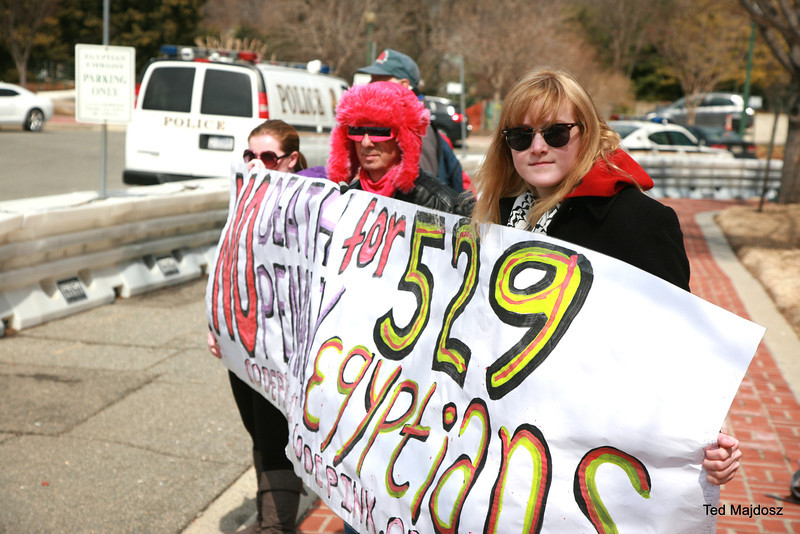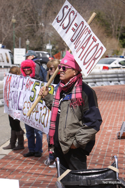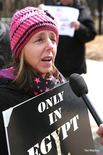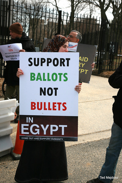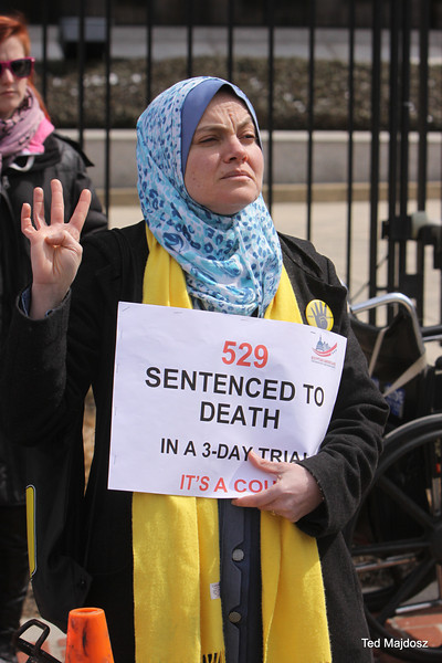 An Egyptian court sentenced 529 supporters of former Egyptian president Mohamed Morsi to death on March 24 for killing a police officer. Today protestors from CODEPINK took their objections to the Egyptian Embassy in Washington, DC: “The trial was clearly a sham and your government, which has jailed over 16,000 people since coming to power, is clearly targeting people based on political affiliation.”