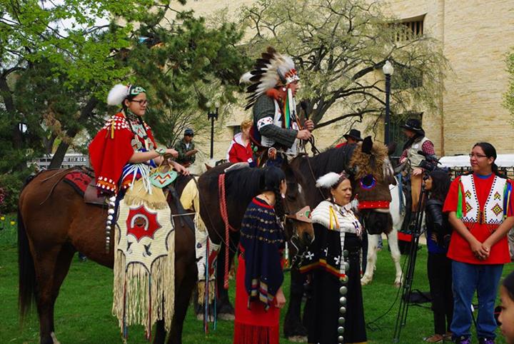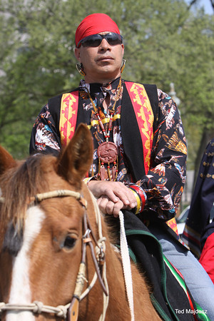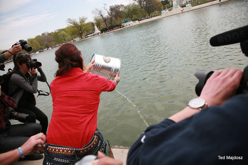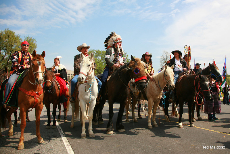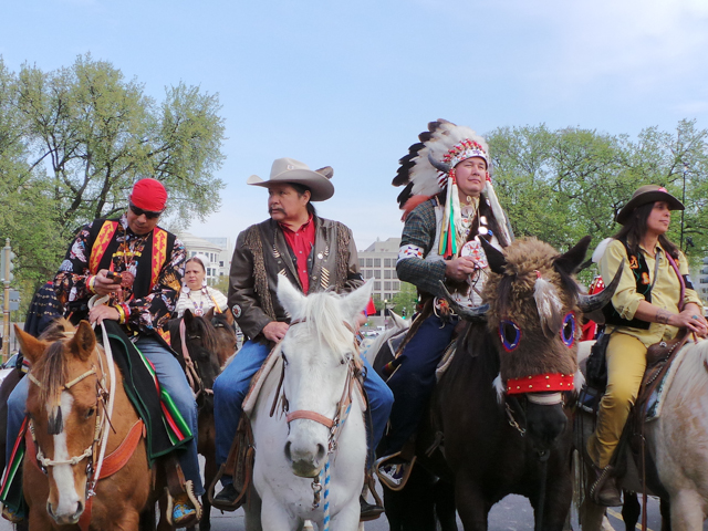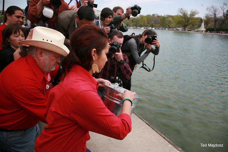 The elder representatives from a dozen tribes rode on horseback with ranchers and farmers to the Capitol Reflecting Pool. They faced West as they lay four rocks on a black cloth and prayed while singing in their native language. Billy Tayak, Chief of the Piscataway tribe which originally inhabited what is now Washington, DC, accepted gifts as ceremonial request for permission to be on his land. Tribal leaders and representatives of ranchers and farmers offered produce from their lands, such as wheat and vegetables–even pickles.