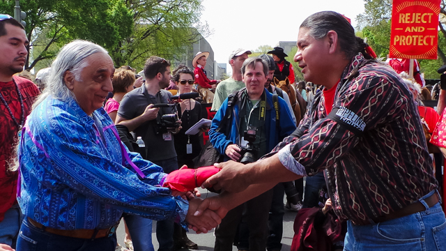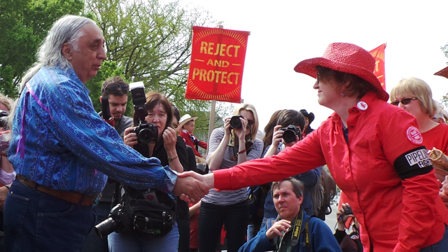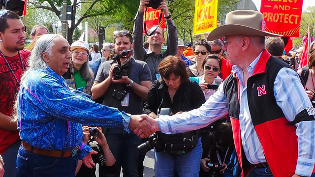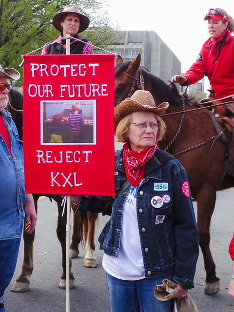 John Harter, a cattle rancher from South Dakota said that he was one of the last holdouts against making an agreement with TransCanada to give up his land rights. His family has owned their farm since 1939. He joined the Reject and Protect demonstration because he felt he had been “strong-armed” by TransCanada. “They came in and told me they were gonna take my property rights,” he said. “What gives them the right to put a pipeline across my land?”