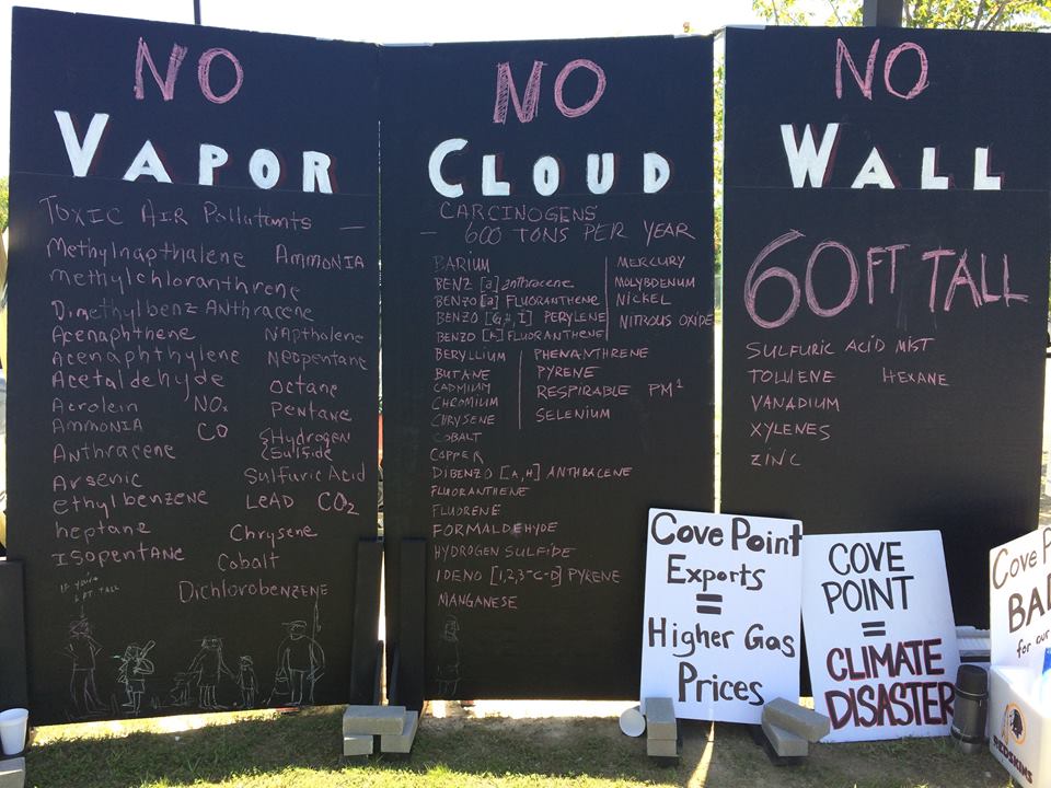 A lot is riding on this project’s approval for Dominion and its bottom line, and it will affect not only the small town of Lusby but the state and region as well with polluting and greenhouse gas-emitting facilities and infrastructure. As potentially one of the first LNG export facilities to become operational in the US, Cove Point has attracted national and even global attention. Saturday’s hearing was the sole opportunity to weigh in publicly on FERC’s recent report. The type of evaluation which FERC conducted has been criticized as insufficient, not taking into consideration the full impacts of extracting, transporting, liquefying, shipping and burning natural gas–from the hydraulic fracking wells of the Marcellus Shale to ports and power plants in Japan and India.