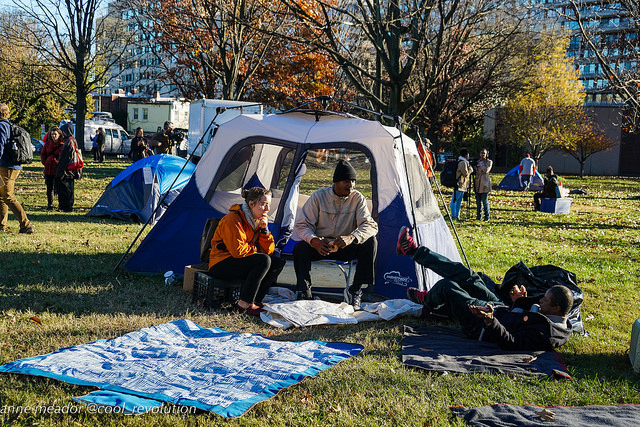 Nearly a week after notices were posted that tents and belongings would be removed, about seven tents remained in defiance of District orders. A fence has been erected to block the large central space. On Thanksgiving, several people dropped by with food for the holiday.