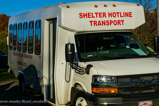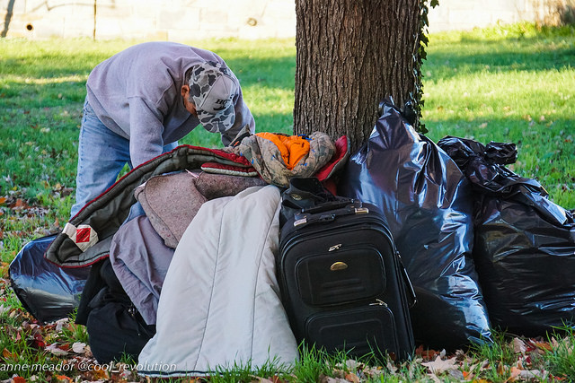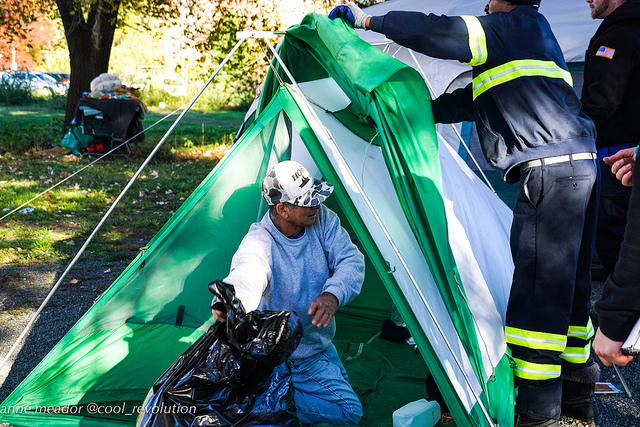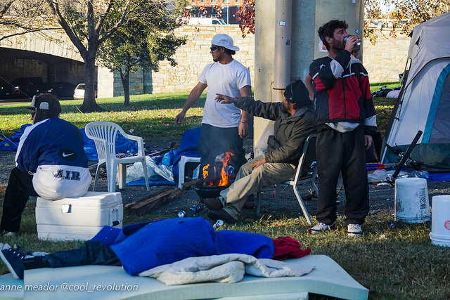 A handful of occupants gathered around a few tents as the rest of the camp was slowly cleared out. Someone built a campfire. One man lay on cardboard completely covered in a blanket except for his shoes. Muddy patches from yesterday’s rain got muddier. A satellite truck from a TV news station was parked next to the bus that read “Shelter Hotline Transport” on the side. Nobody got on it.
