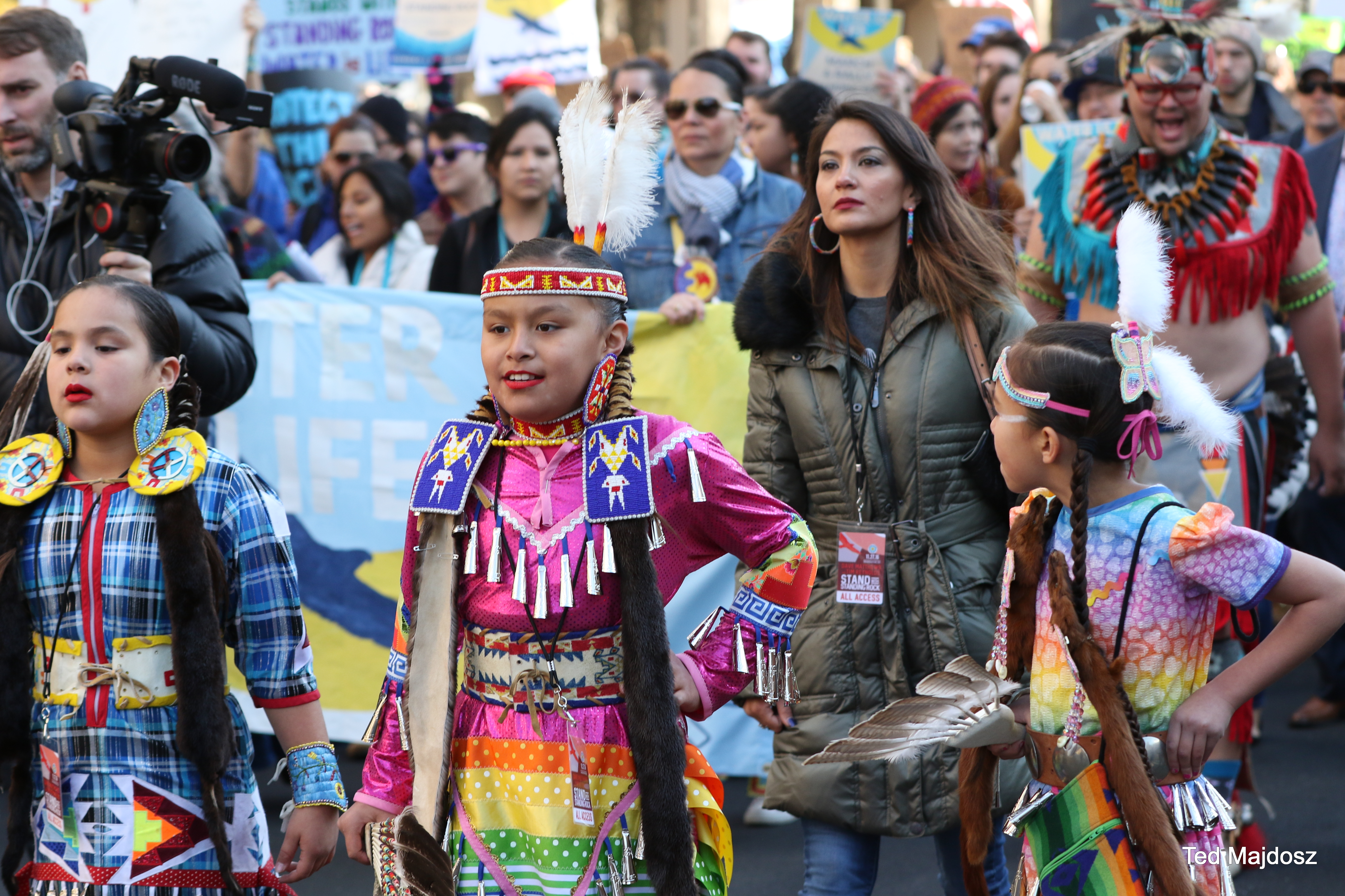 Marchers chanted, “Can’t drink oil, keep it in the soil,” “Who do we stand with? Standing Rock,” and “Mni wconi, water is life!” Among the signs, some read, “Honor the treaties,” referring to the U.S. government’s treaties with the sovereign American Indian nations governing the land appropriated by Dakota Access LLC for its pipeline. Other signs read,”Defend the Sacred: We Are Still Here” and “Respect Existence, Expect Resistance.”