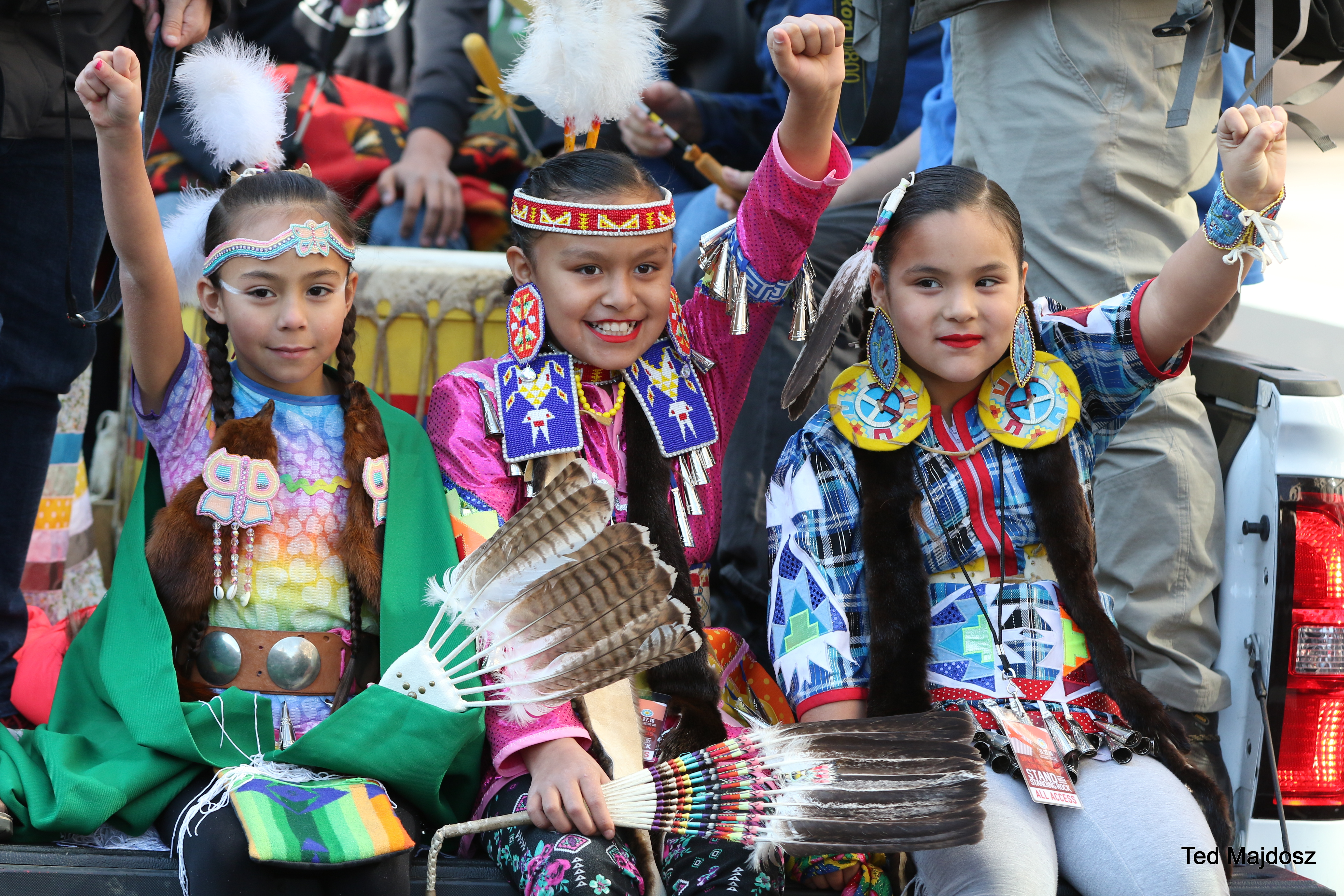 The march, organized by Last Real Indians, was accompanied by a drum circle and singers in a pick-up truck preceding the marchers. Three girls in “jingle dress” and five Native Americans in ceremonial dress danced and marched proudly up Pennsylvania Ave. in front of hundreds with banners and signs.