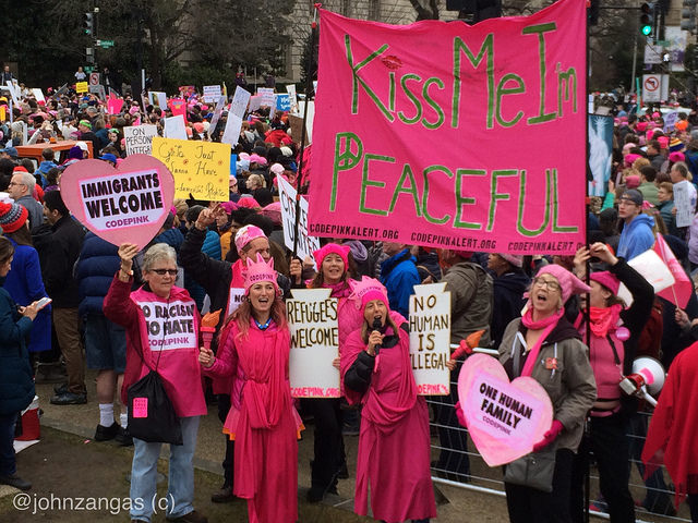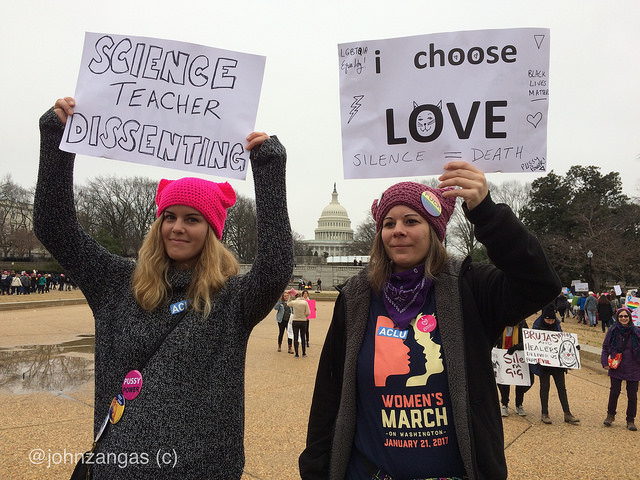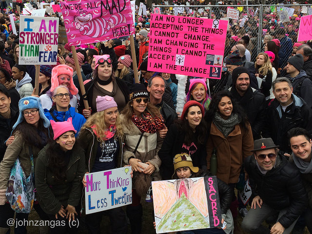 The Women’s March on Washington squeezed in hundreds of thousands, completely filling the National Mall. Many wore pink “pussy hats” knitted and donated by volunteers from around the country. The event was created by three women on Facebook the day after the election.