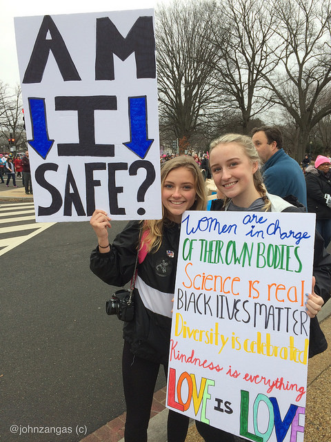 Marchers joined in waves of cheers and chants which spread along the streets as they walked. They chanted popular rhymes such as, “We want a leader, not a dirty tweeter,” a criticism of Trump’s statements on Twitter, and, “It’s my body,” a statement of concern about the new administration’s plans to defund Planned Parenthood and women’s healthcare.