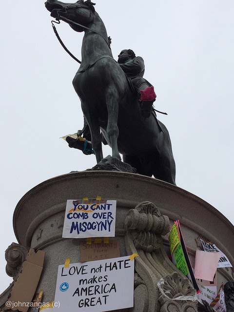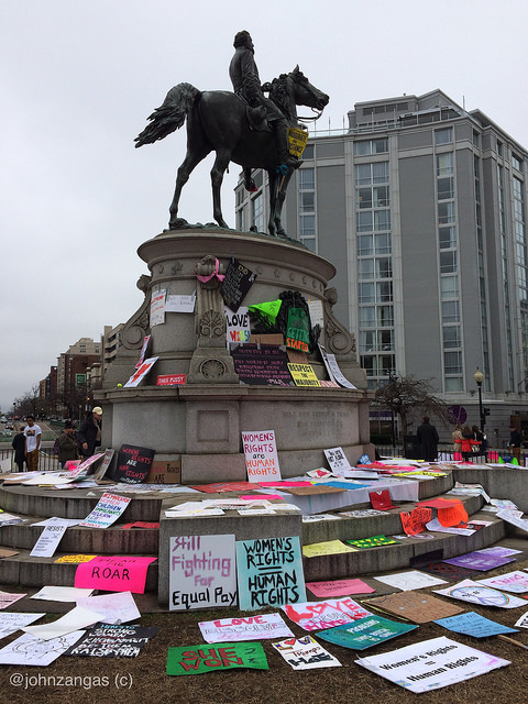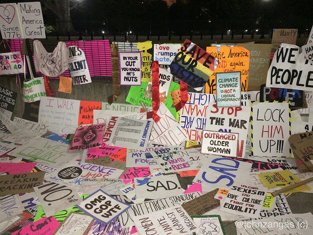 As marchers passed the White House fence, they left behind handmade signs, which formed a long wall of messages to the new President. They also left hundreds of signs at Trump International Hotel, at major traffic circles–such as McPherson Square and Scott and Logan Circles–and throughout the downtown area.