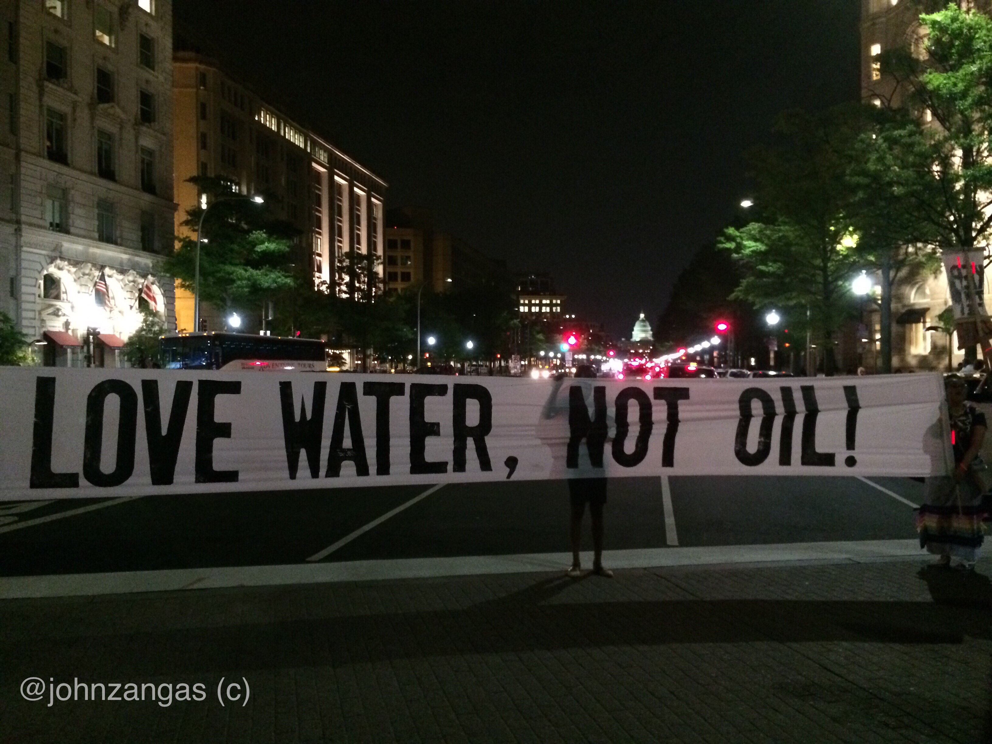 The public was invited to join in the Round Dance and join hands with indigenous People. As the circle grew, about 300 moved off the sidewalk and blocked Pennsylvania Avenue. They repeated a well known Lakota language chant, “Mni Wiconi”, meaning “Water Is Life”. They stayed in front of Trump International Hotel for about two hours.