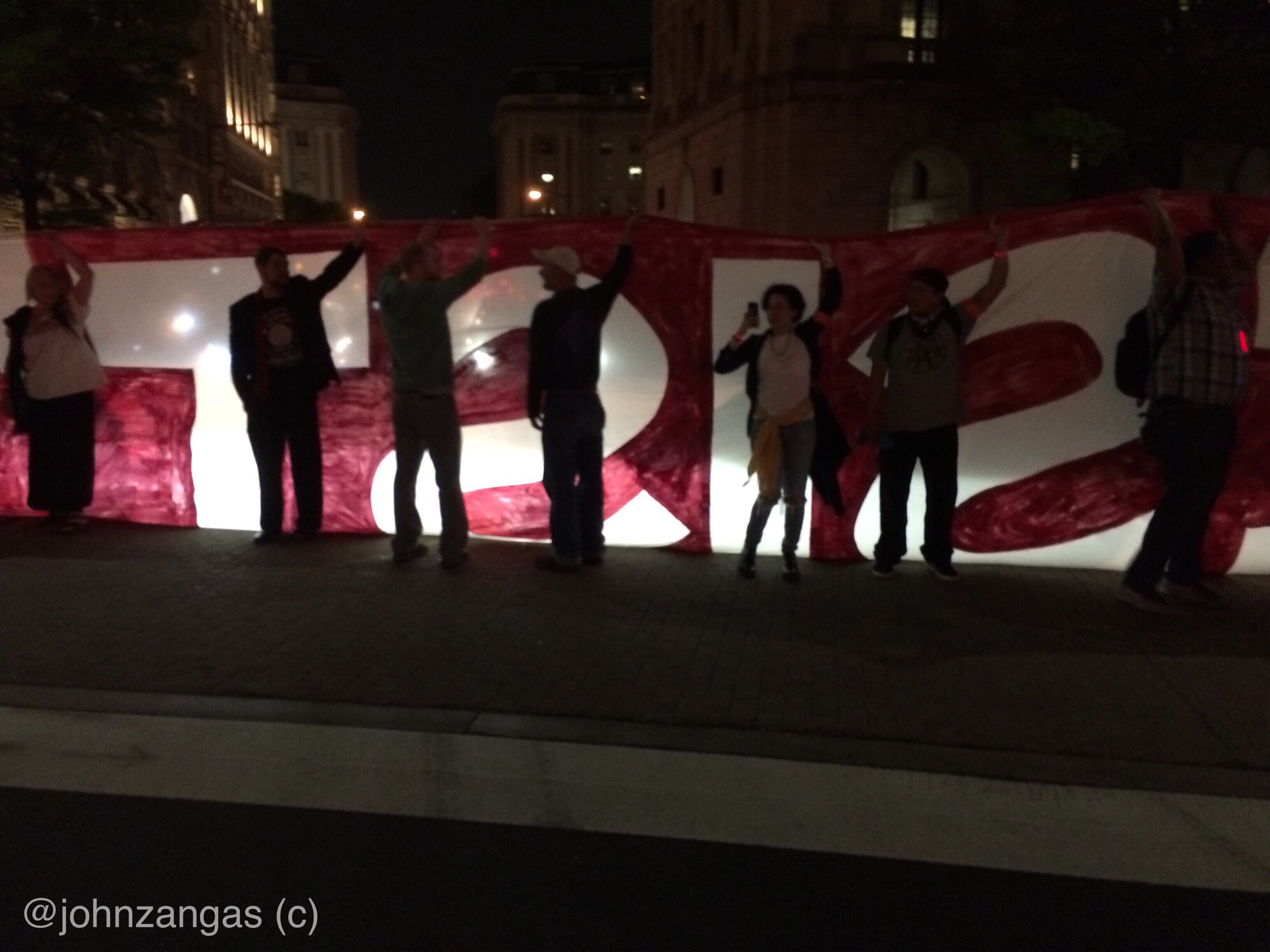 Washington, DC–Indigenous people held a nighttime Round Dance in front of Trump International Hotel Thursday night as a prelude to the People’s Climate March. It was organized by the Indigenous Environmental Network and joined by many Indigenous groups and supporters.