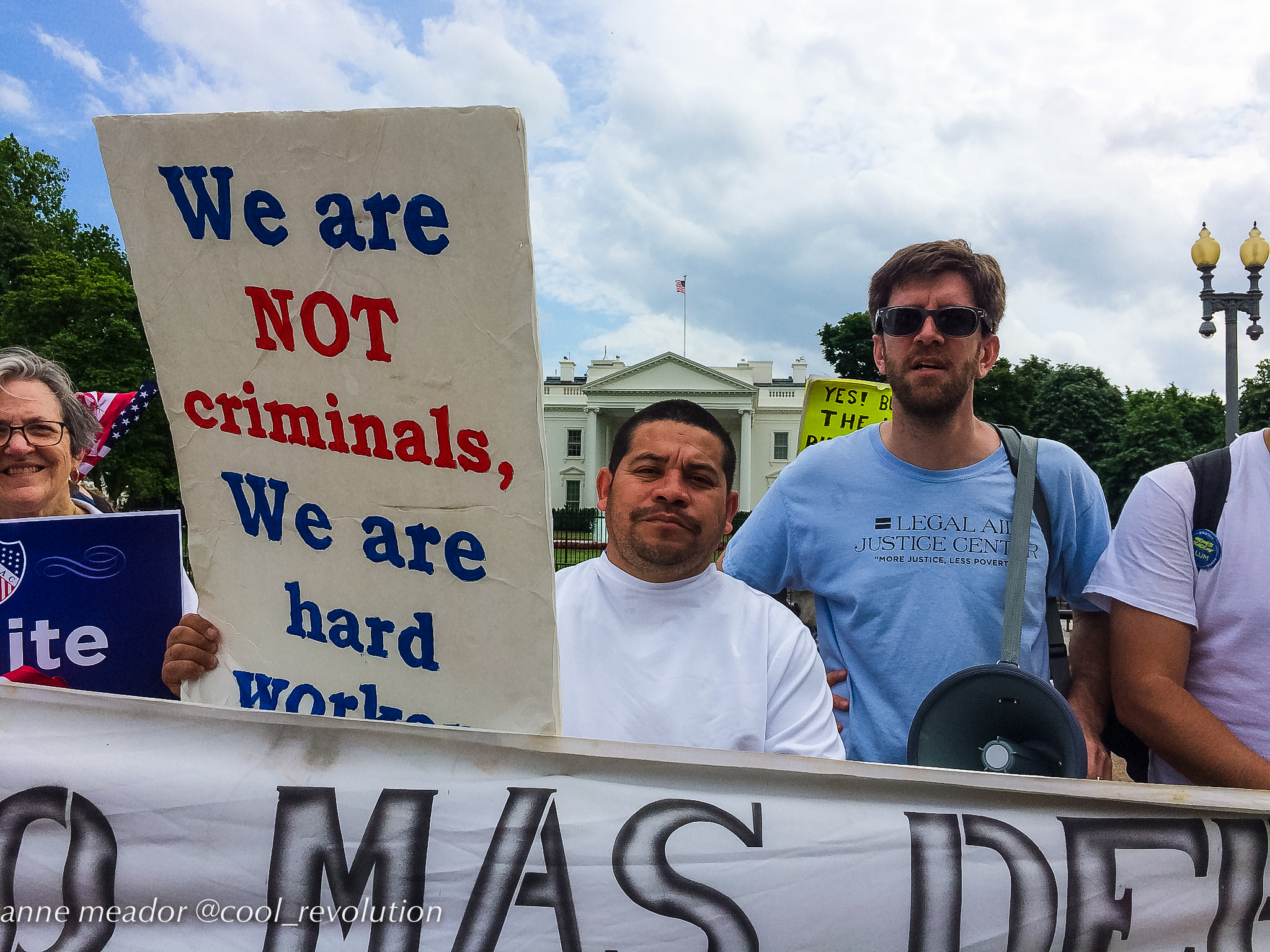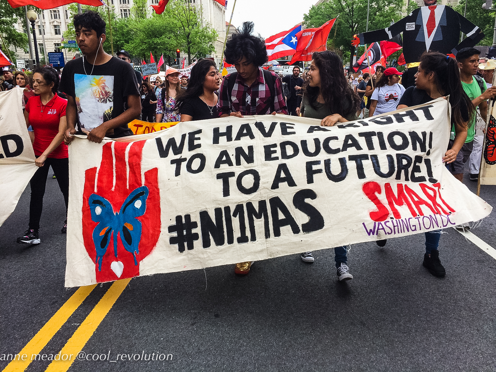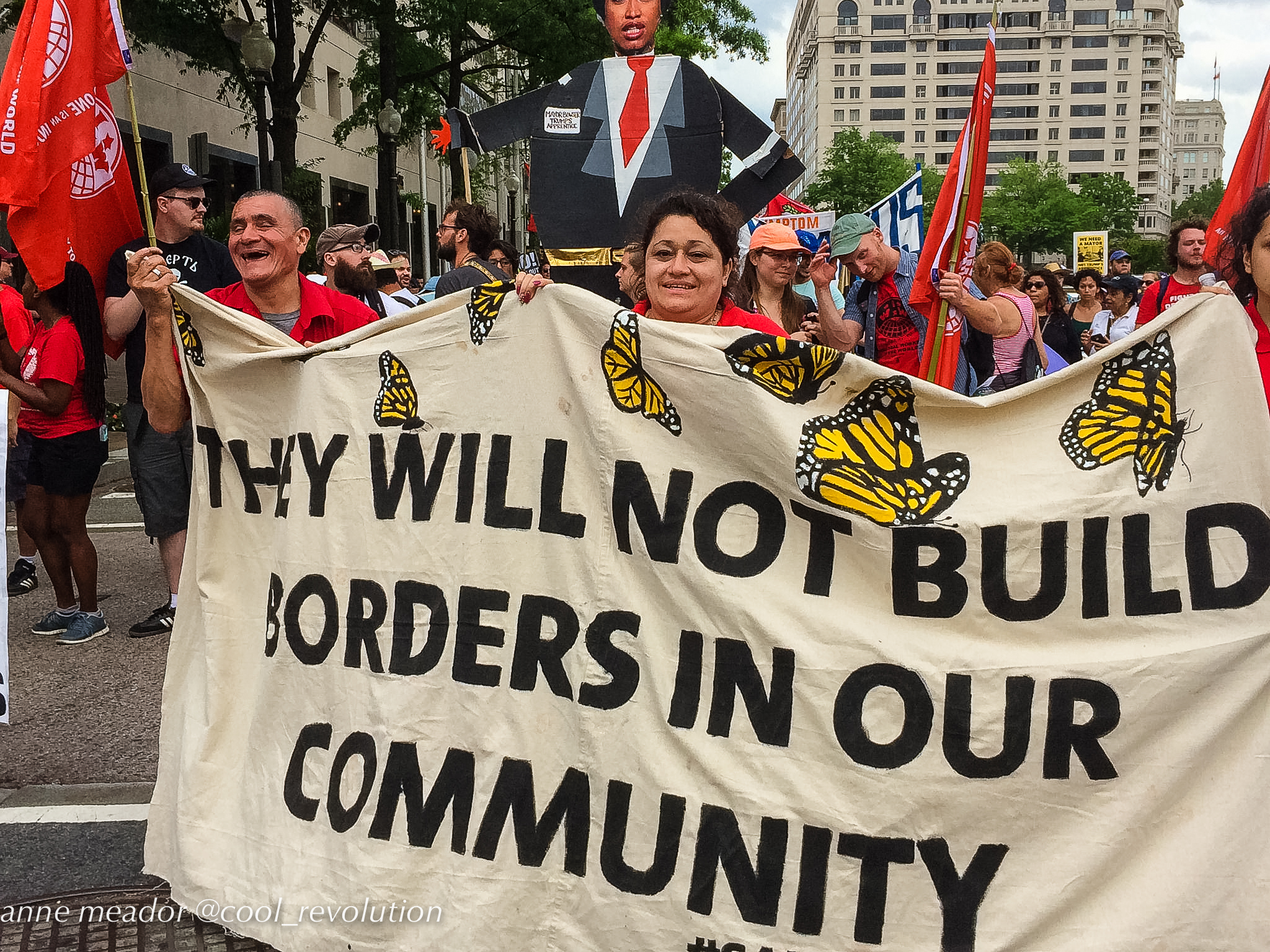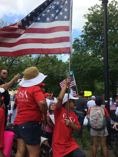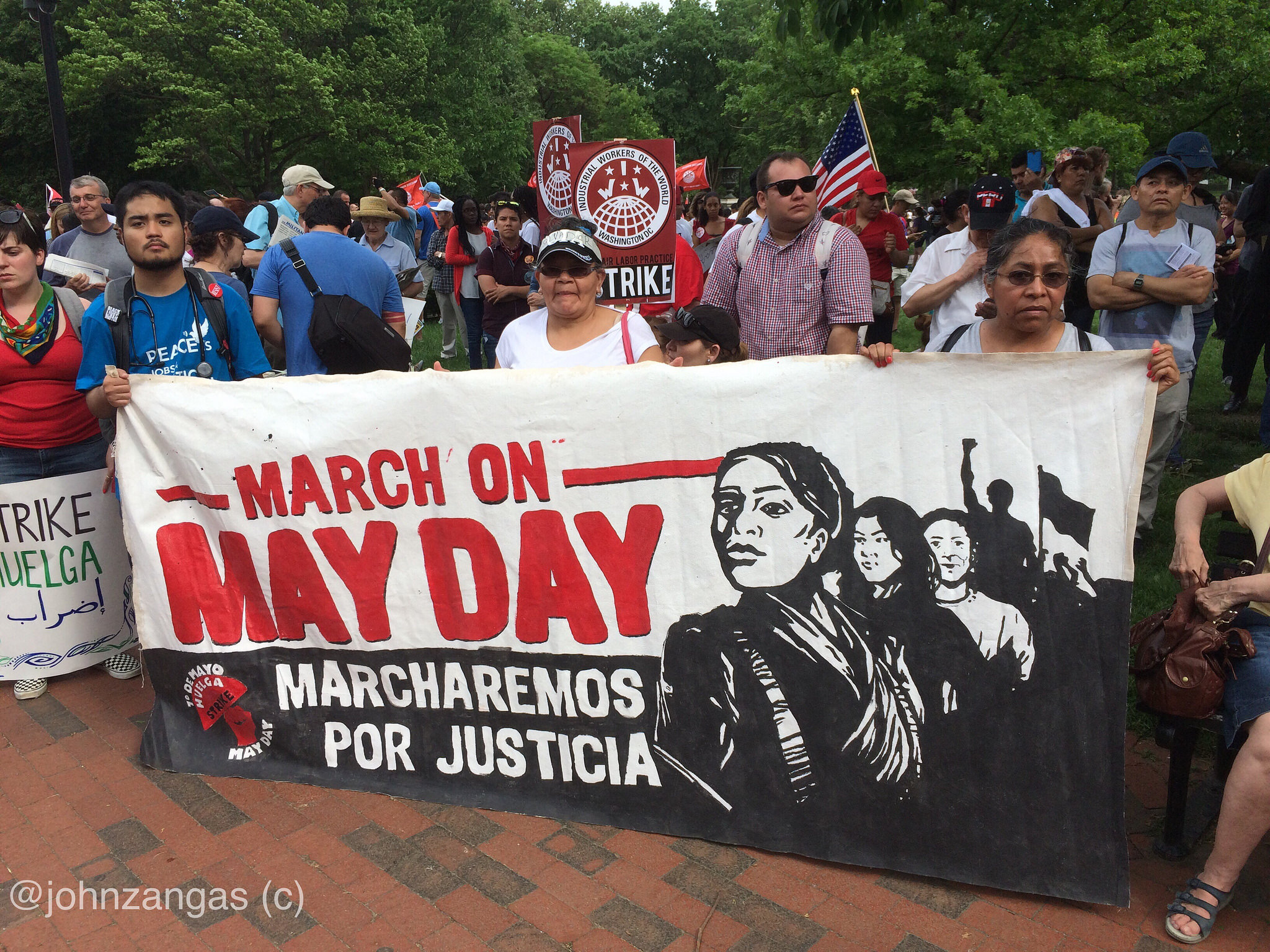 Crowds filled Dupont Circle, Malcolm X Park, Freedom Plaza, and Courthouse in Arlington, then converged into marches to the White House. American flags mingled with Mexican flags and bright red socialist flags. Many of the large number of Hispanic participants were immigrants from Mexico and Central American countries, and, in spite of risks, even undocumented immigrants were present and vocal.
