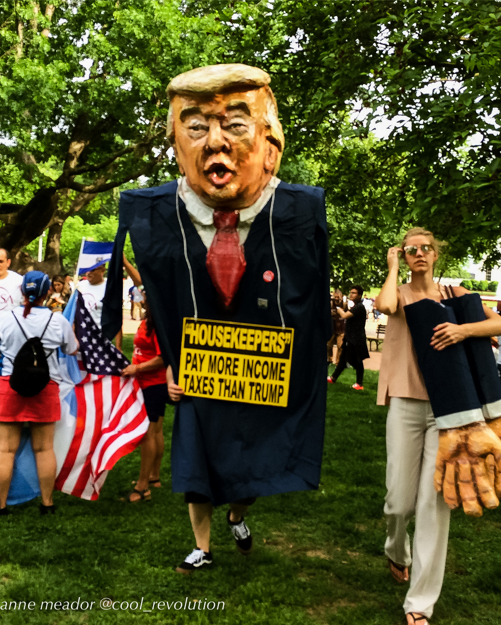 Workers are worse off now than two generations ago when you compare the buying power of wages adjusted for inflation, and benefits are hard to come by. The privileges afforded to the “One Percent” exacerbate hard feelings. A giant Trump puppet, for example, carried a sign which read, “Housekeepers pay more income taxes than Donald Trump,” referring to the income tax write-off many suspect he has enjoyed for 20 years. Although many accuse undocumented immigrants of being a burden on society, speakers pointed out that even undocumented workers pay taxes, and moreover, businesses are inclined to take advantage of their vulnerable status.