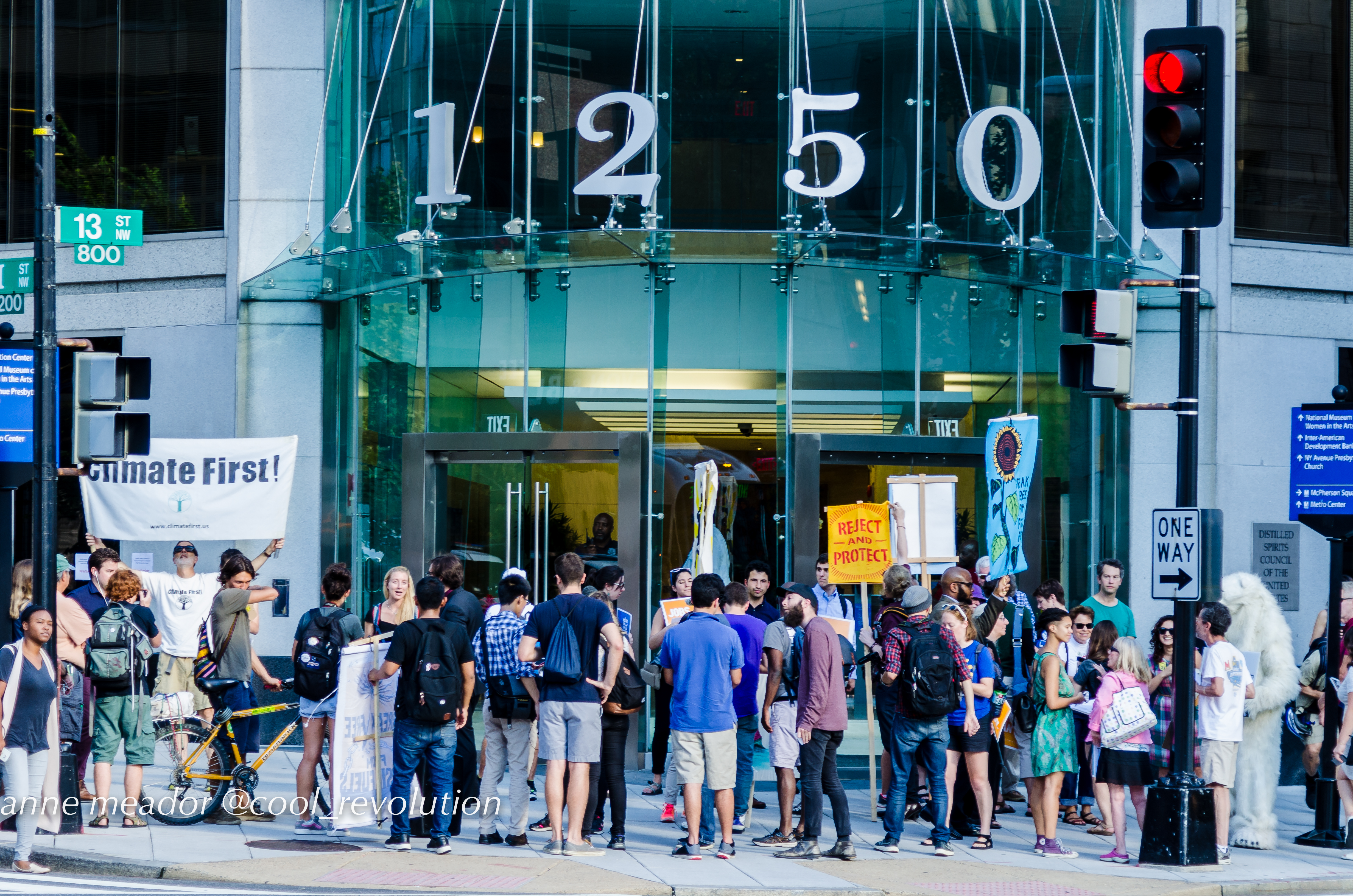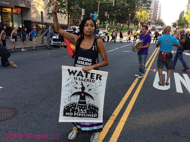 Washington, DC — More than a hundred protesters and “water protectors” held a rally at TransCanada’s corporate office on Tuesday followed by a Native American round dance in the middle of 13th St., stopping some late rush-hour traffic. Familiar Keystone XL pipeline signs and banners were deployed once again, some even going back to the Forward on Climate March in 2014.
