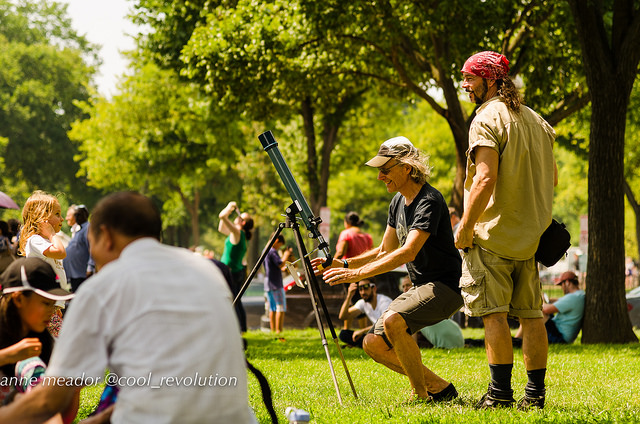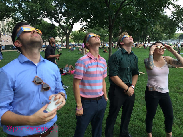 The Smithsonian Air & Space Museum gave out free solar glasses on the National Mall. The line was a half-hour wait. Eclipse hunters also brought their own modern devices: telescopes, telescopic cameras and cell phones. One man brought a welder’s helmet. Some brought simple handmade devices: cardboard boxes and pin-holed papers, which help them to safely view the image of the moon crossing in front of the sun.