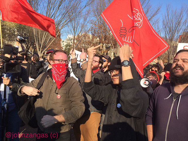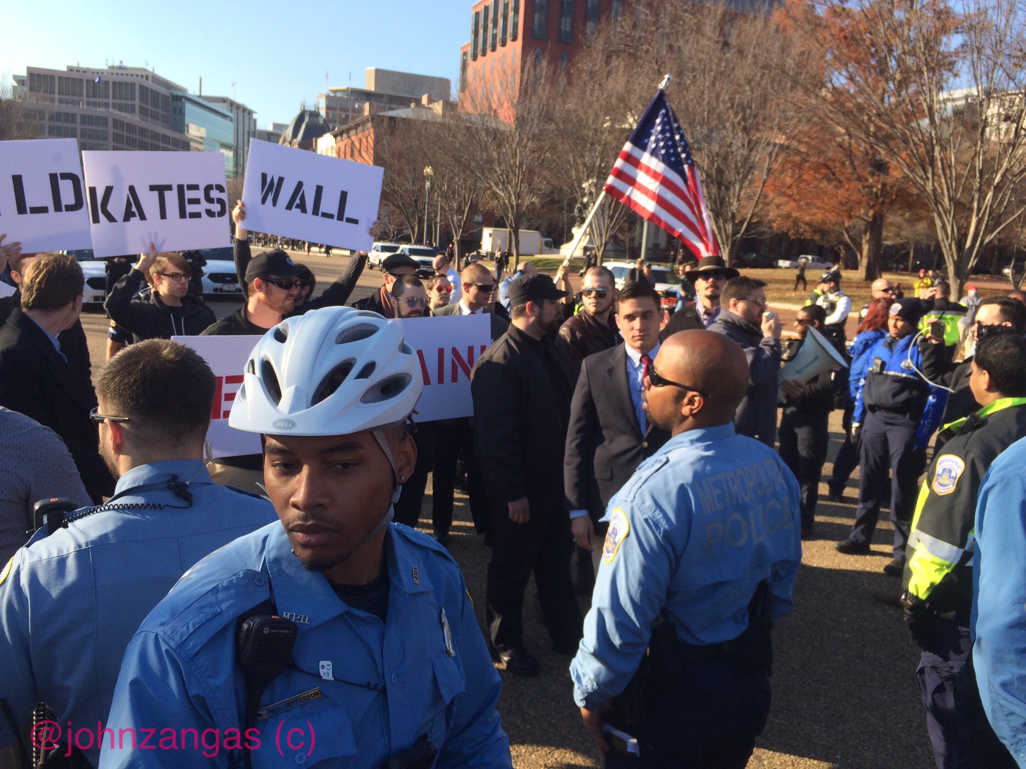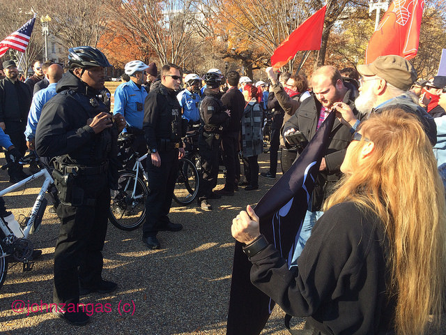 They persisted in shouting down Spencer’s attempts to be heard from behind a wall of police, which by then had circled around to protect him. Spencer’s group soon departed along Pennsylvania Ave., escorted by Secret Service and DC Metropolitan Police. Police kept counter-protesters from following the group as it left.