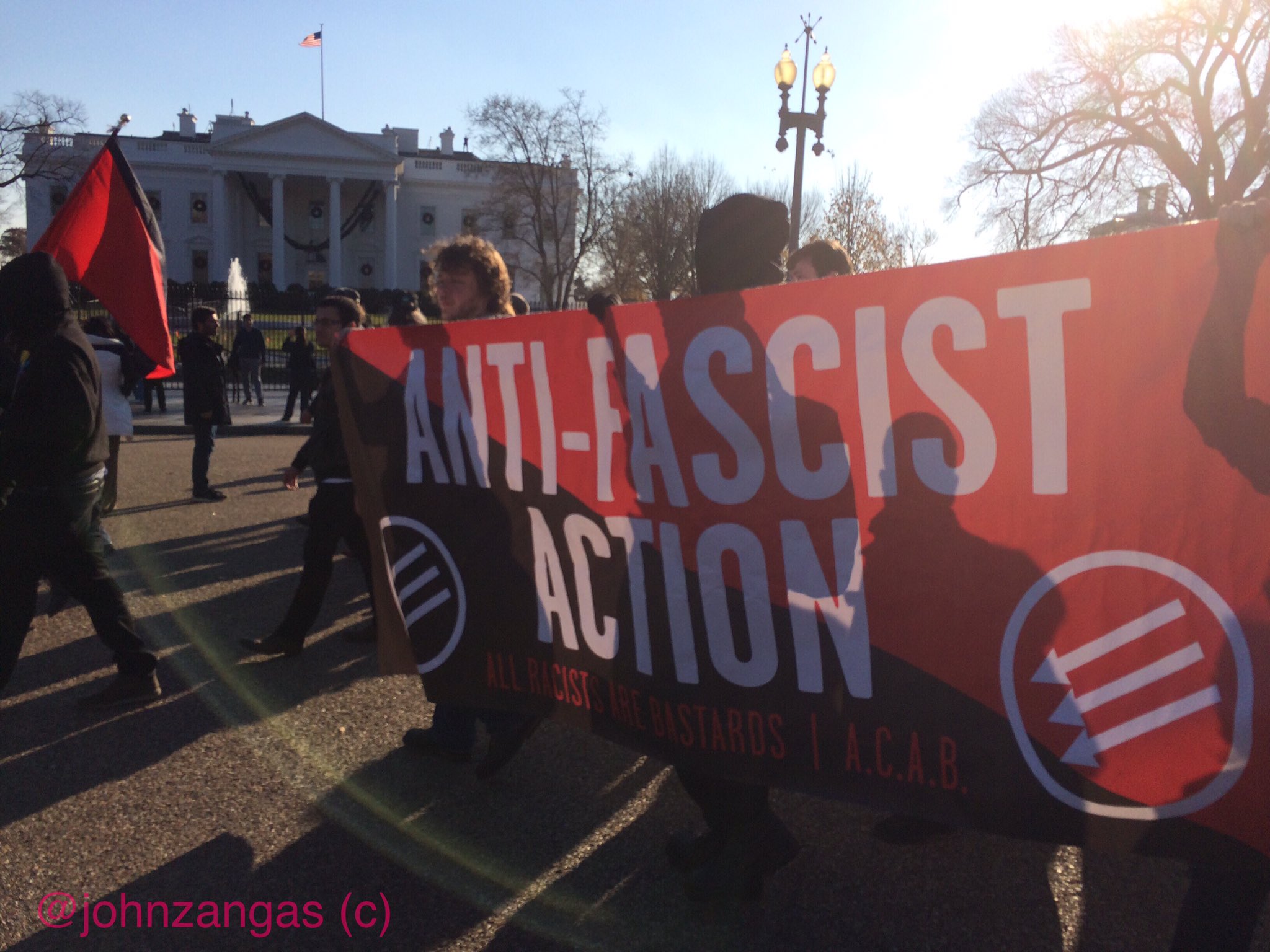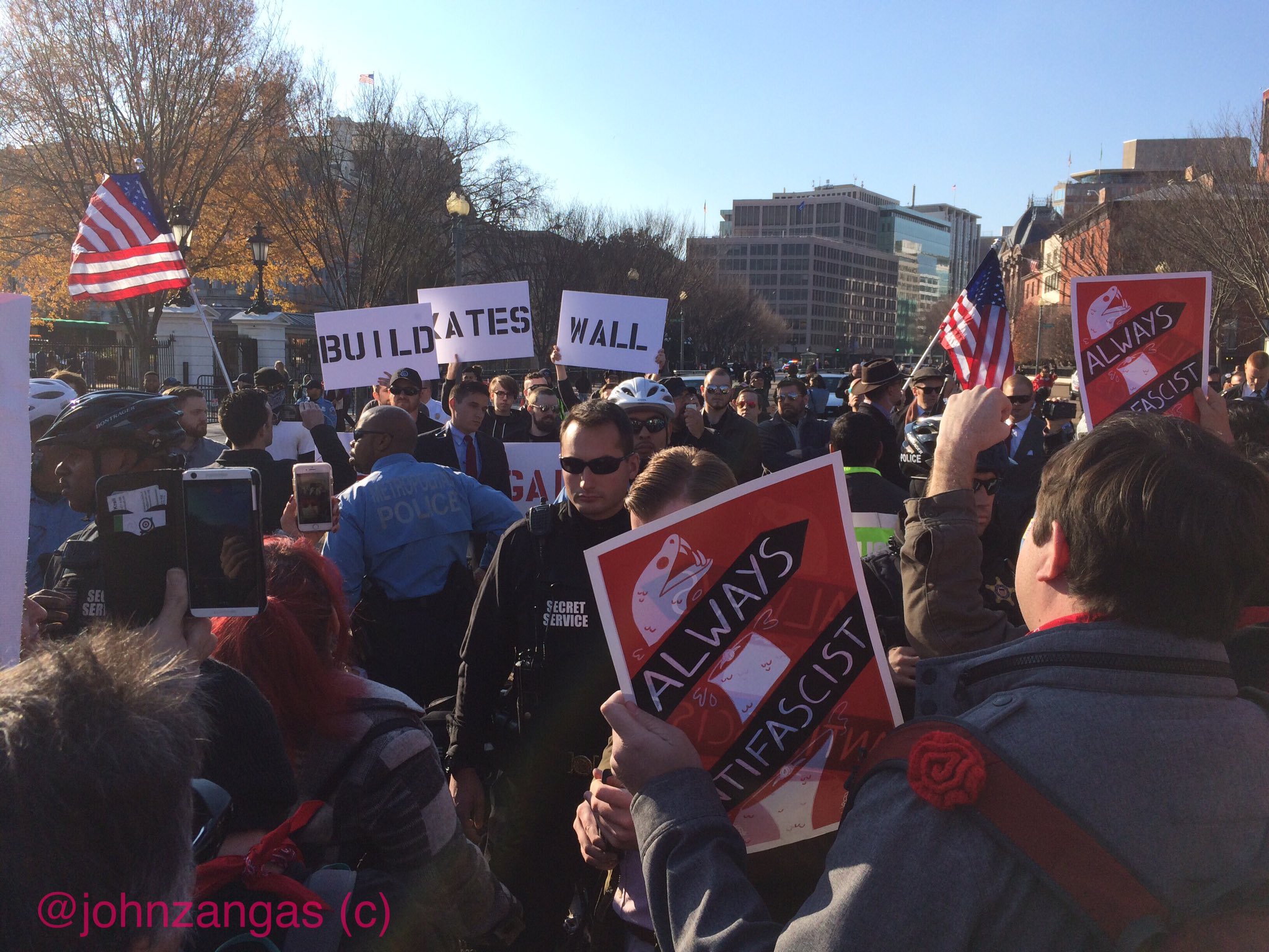 About 75 counter-protesters confronted Spencer and his Nazi group on Pennsylvania Ave. as they marched toward Lafayette Square, blocking them from reaching the front of the North Portico side of White House. Police scrambled to separate the two groups with a cordon as they met, then quickly inserted metal barricades between the two sides before any skirmishes could break out.