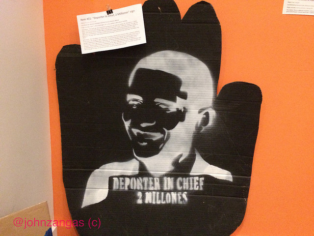 A stencil poster entitled “Deporter In Chief” was spray painted black and white, depicting a silhouette of Obama with the caption “2 million deported,” drawing attention to the immigration issue as not just being a partisan issue but a human rights issue confronting both conservative and progressive political agendas.