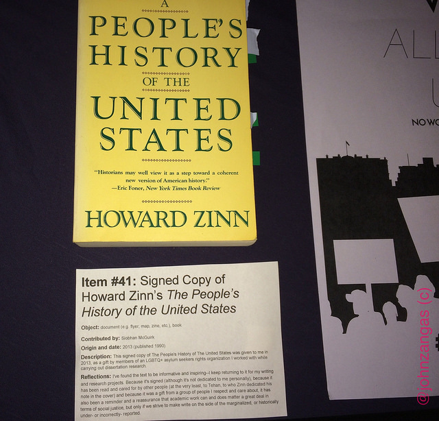 A signed copy of Howard Zinn’s book “A People’s History of The United States” was a personal item contributed by McGuirk herself. The book was a gift from an LGBTQ group of activists she previously worked with. “It’s got this personal touch,” she said as she thumbed through pages she had tabbed. “It reminds me that scholarship is important, but only if you make it important. You can’t just say, ‘I’m a historian and therefore I’m important’–that’s how Howard Zinn put it–you can’t stand still on a moving train.”