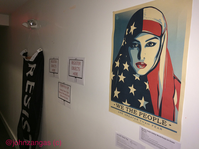 A “pussy hat” with buttons was submitted by a woman who went to the Woman’s March the day after Trump’s inauguration. There were environmental protest posters, stickers from an anti-fascist group, a giant “Resist” banner, and handmade one-of-a-kind signs. A cloth banner was signed by women of the Occupy Movement.