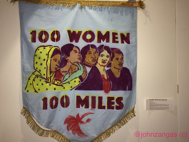A fabric banner which was carried for 7 days for the 100 Immigrant Women’s March, from Philadelphia to Washington, DC, was accompanied by its construction materials, including acetate stencils and painting tools. The march coincided with the Pope’s visit in 2015. “The act of cutting it out, spray painting and laying it out is building community and building power and it is why we included this,” said McGuirk. The march started at Liberty Park in Philadelphia and ended in McPherson Square.