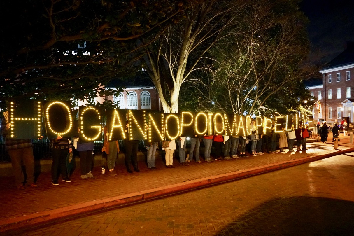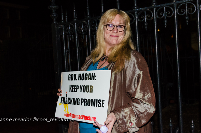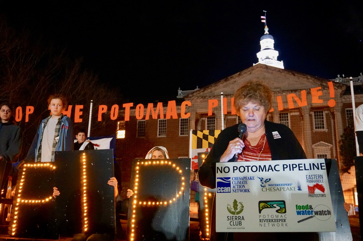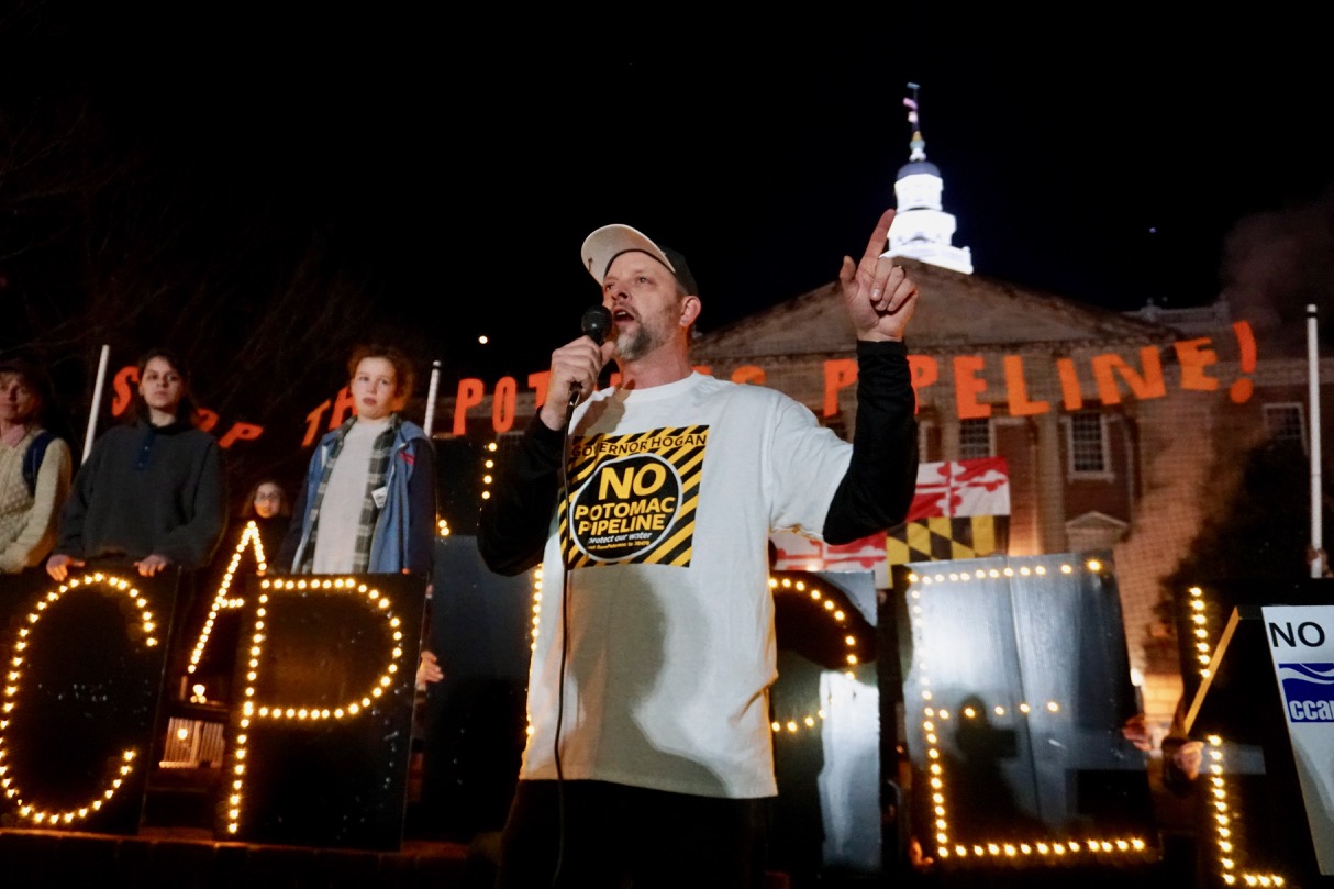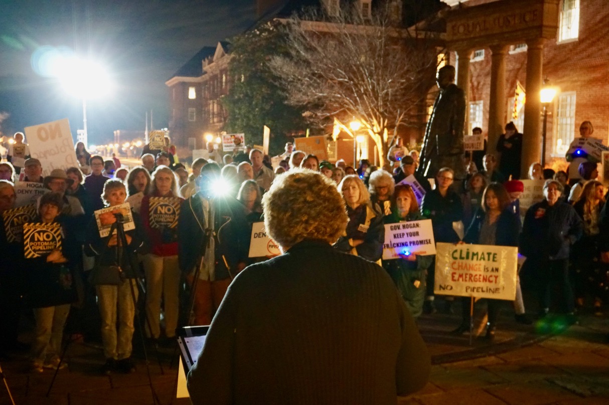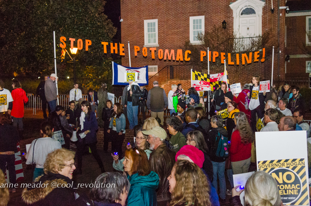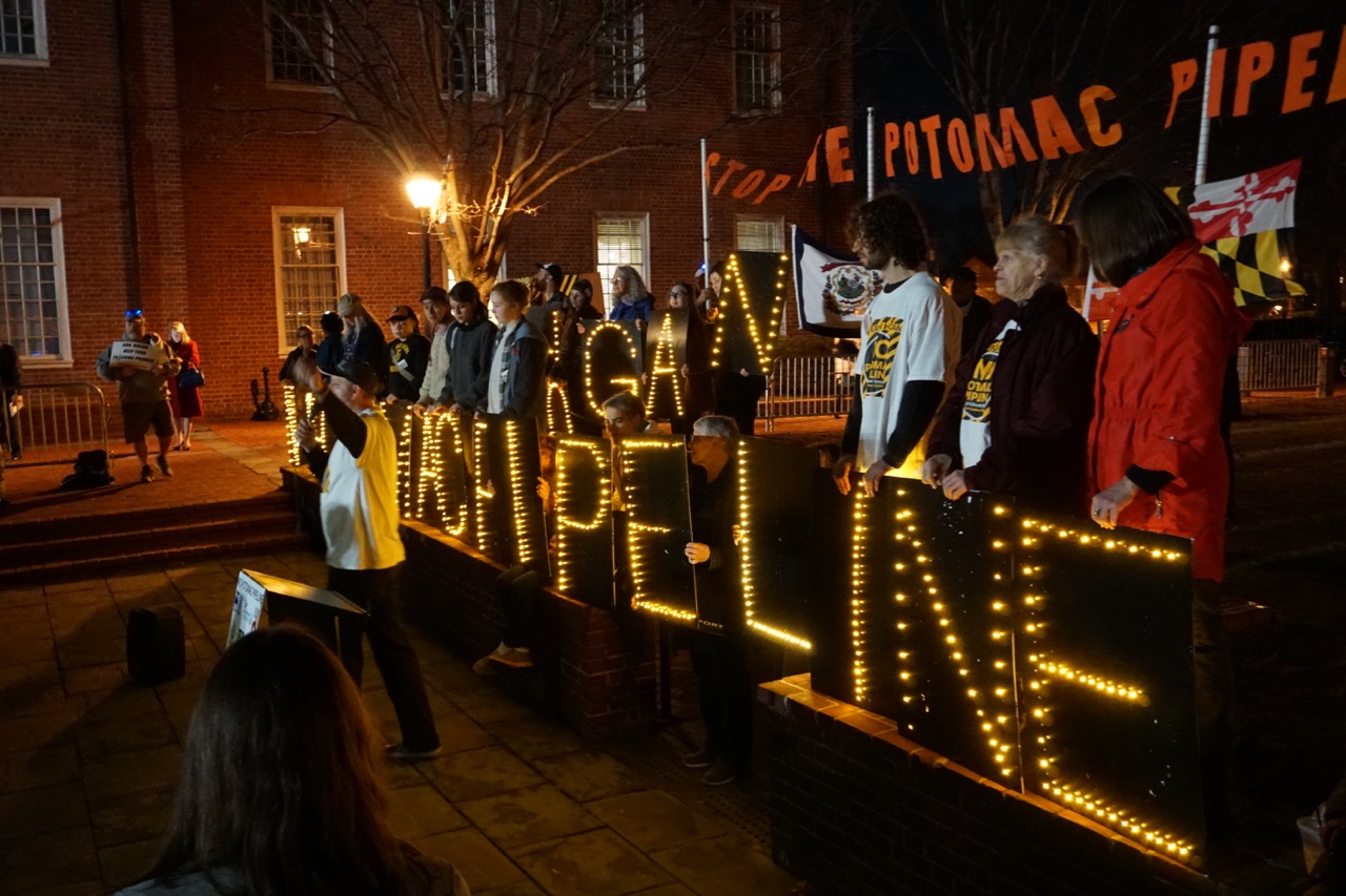 About 250 people rallied on Lawyer’s Mall in front of the Maryland Statehouse on the evening of February 15, then surrounded the Governor’s Mansion with signs, candles and light boards spelling out “Hogan, No Potomac Pipeline.” A bagpiper played and circled the mansion as protesters yelled, “No Potomac Pipeline!”