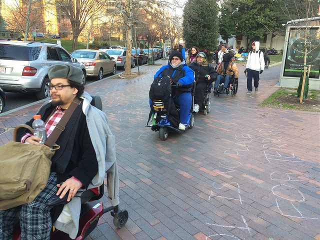 About fifty people from the disability rights group ADAPT started the park’s occupation, which is being live-streamed across the Internet to thousands. They say they will not end their protest until the regulations ending GED are signed and enacted by Dr. Gottlieb.