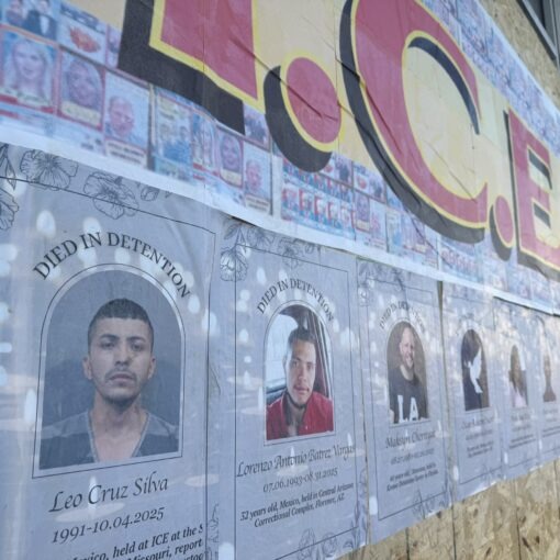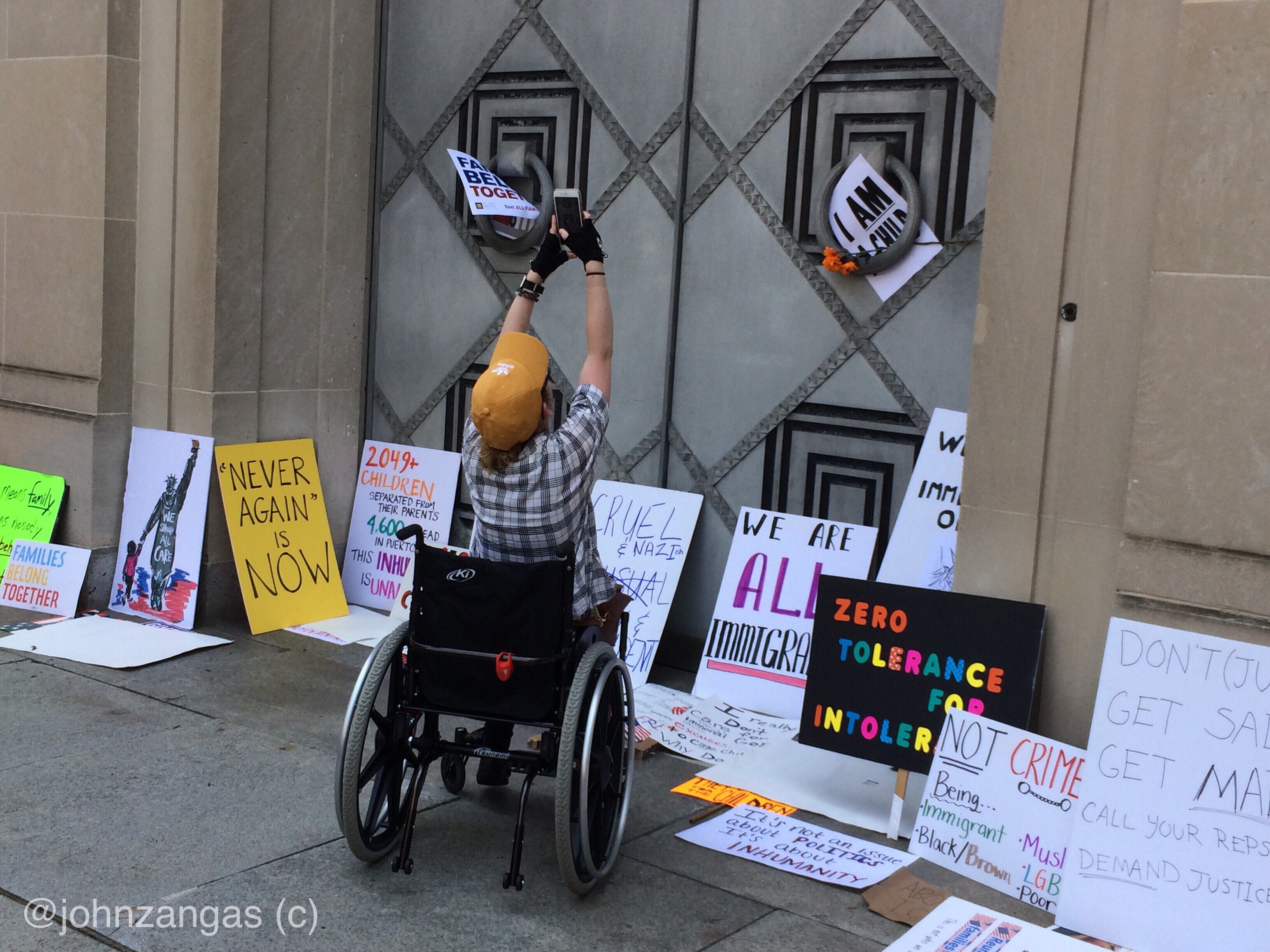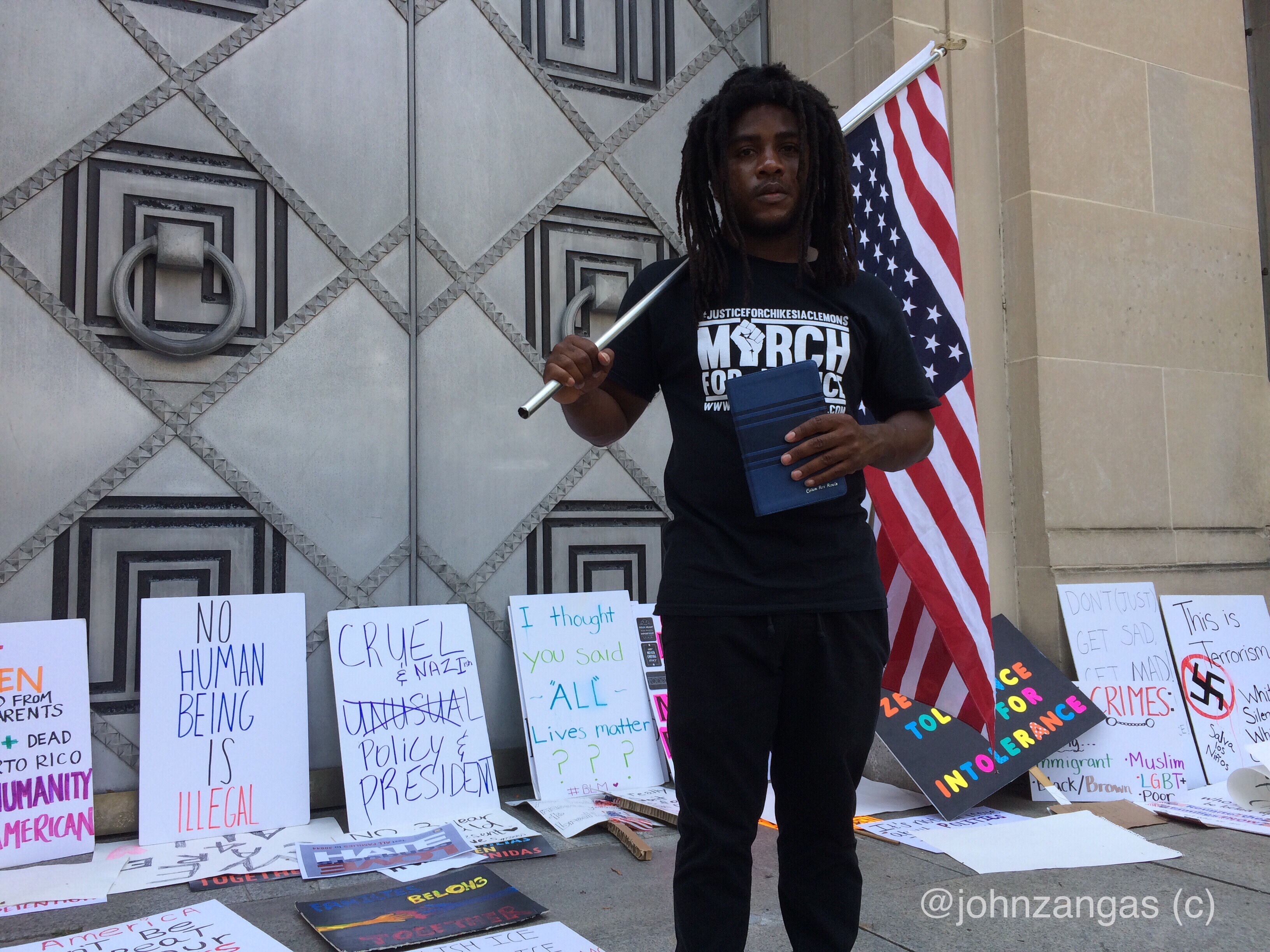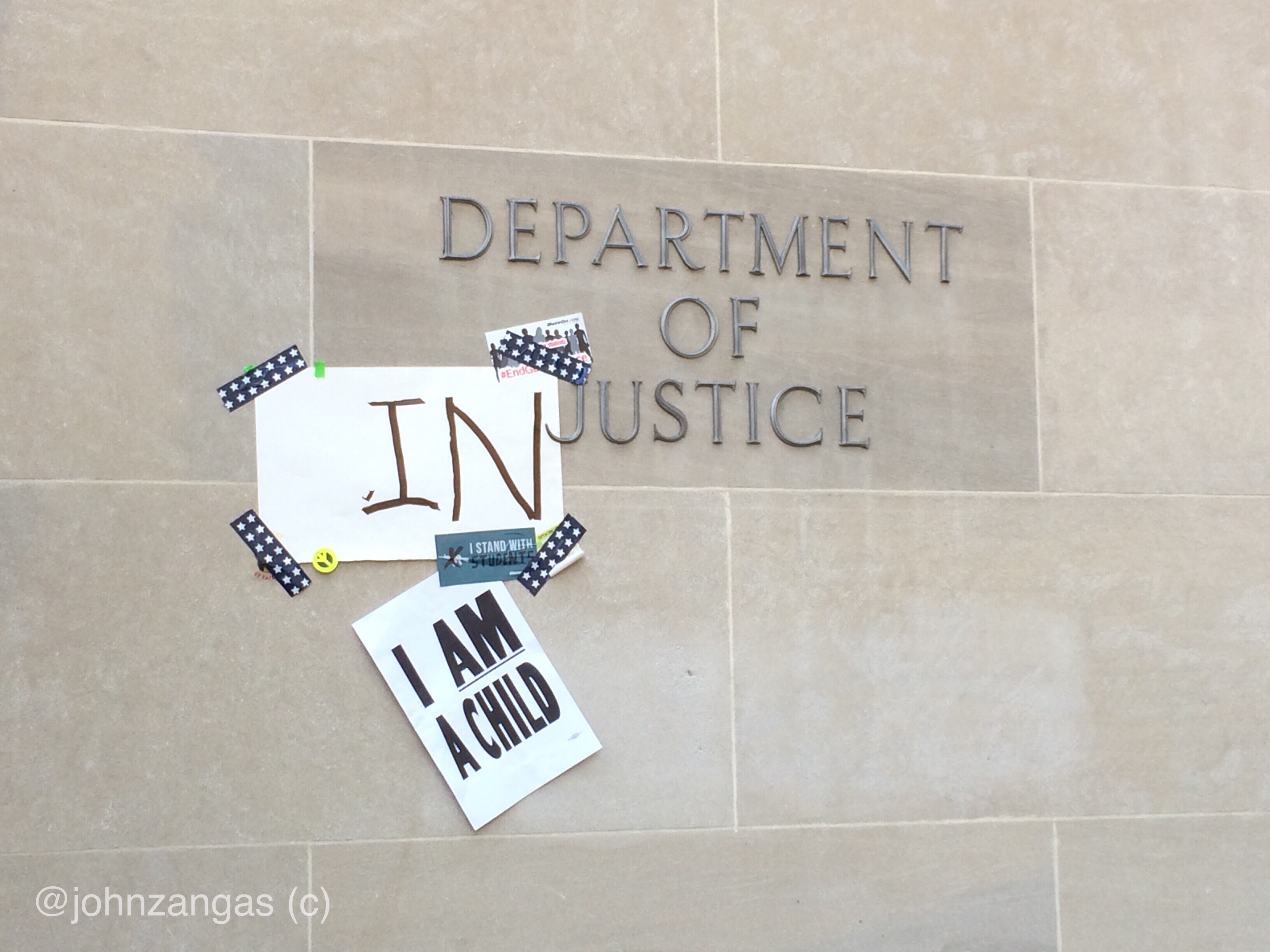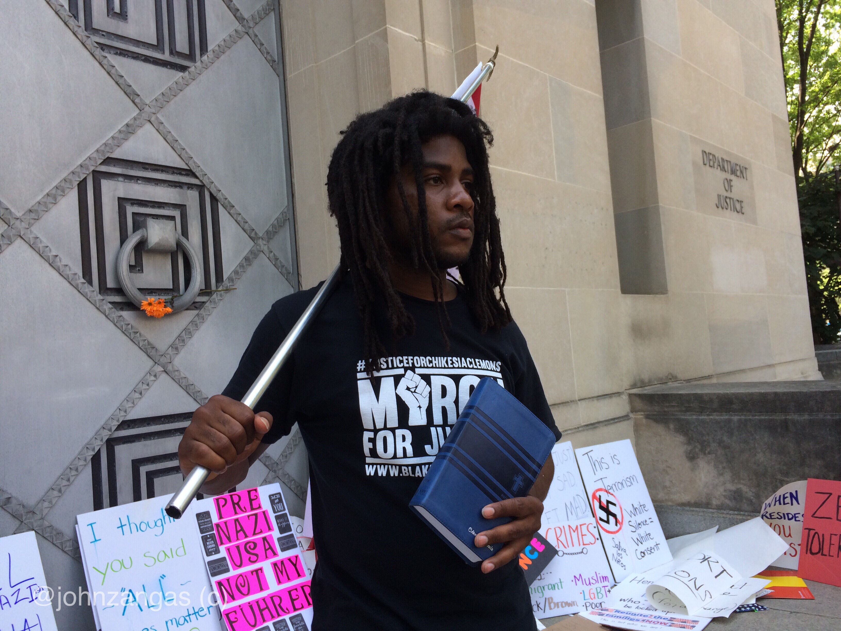 They walked to the Department of Justice, chanting “What do we want? Justice! When do we want it? Now!,” along the way. They placed signs against the large metal doors. Someone taped the words “In” over the limestone block on the wall of the building, changing its title to “The Department of In-Justice.” An immigrant stood holding a flag draped around him with a Bible in his other hand.