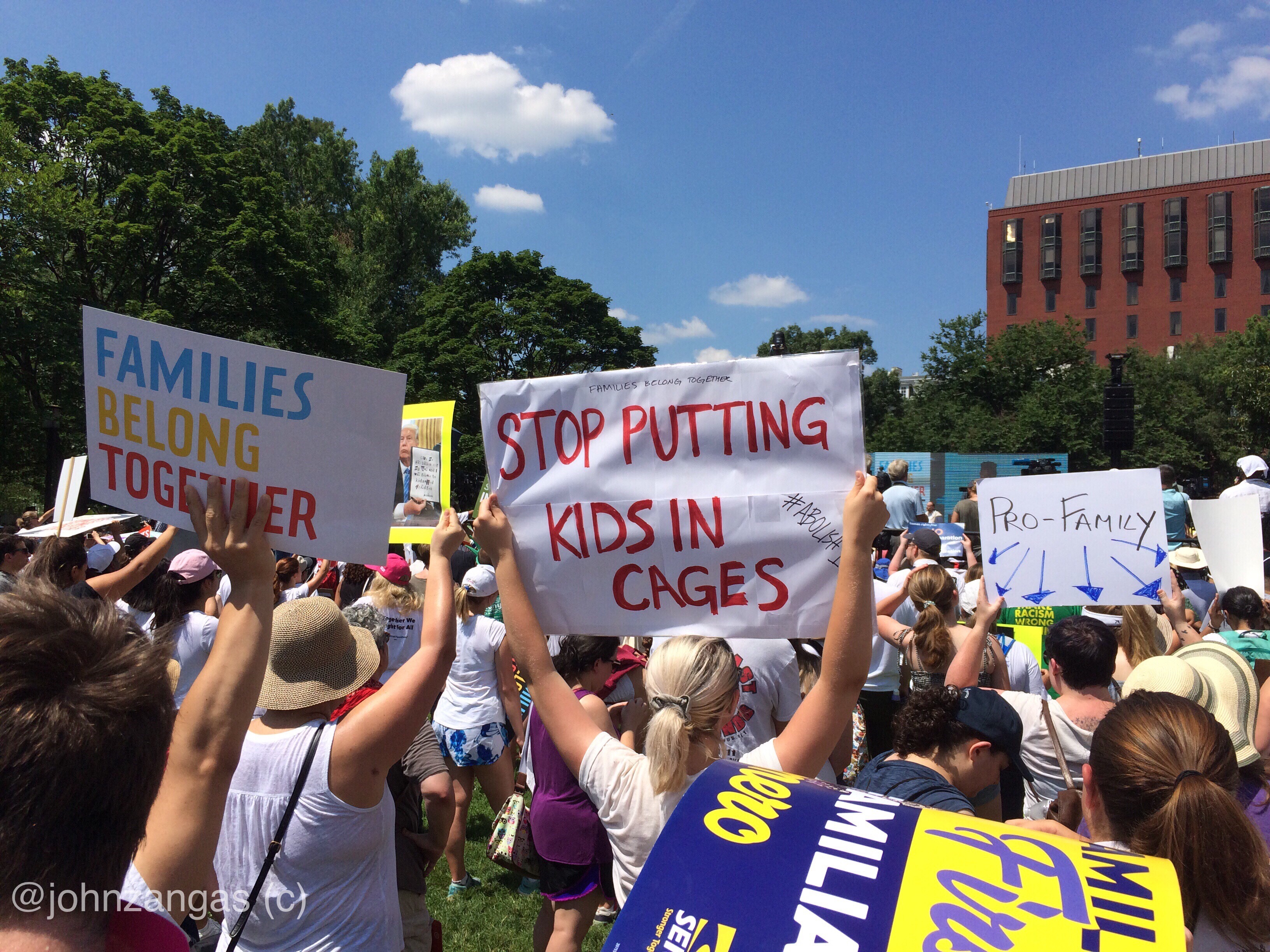 Washington, DC — Thousands of protesters, including many families with children, rallied at the White House Saturday to condemn the Trump Administration for separating children from parents at U.S. borders. Over 30,000 took part in the Families Belong Together rally for three hours, standing in the hot June sun while dozens spoke out against the “zero tolerance” immigration policy, which in some cases has led to young children being held in chain-linked enclosures resembling kennel cages.