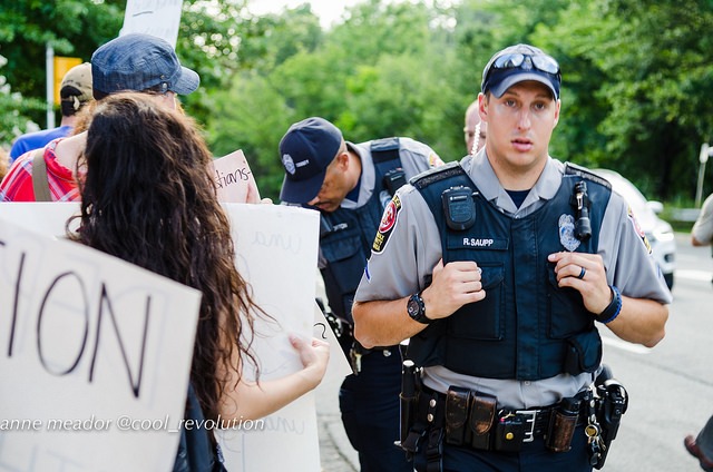 The office complex’s plaza had already been cordoned off well before any protesters arrived. About 20 officers were stationed outside the buildings surveying the protest on the public sidewalk below and took pictures of protesters and members of the press. After the demonstration had concluded, six plainclothes officers sat on the patio of a nearby local restaurant and took pictures of departing protesters and members of the press.