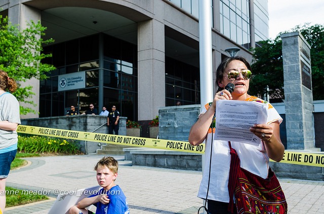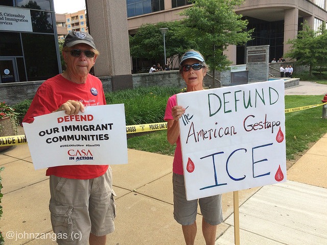 About a hundred people protested at the U.S. Immigration and Customs Enforcement (ICE) field office in Fairfax County, Va. today, saying that the agency inflicts violence on immigrant families and communities. They demanded that Members of Congress cut off funding for ICE and U.S. Customs and Border Patrol and revert the money back to their communities.