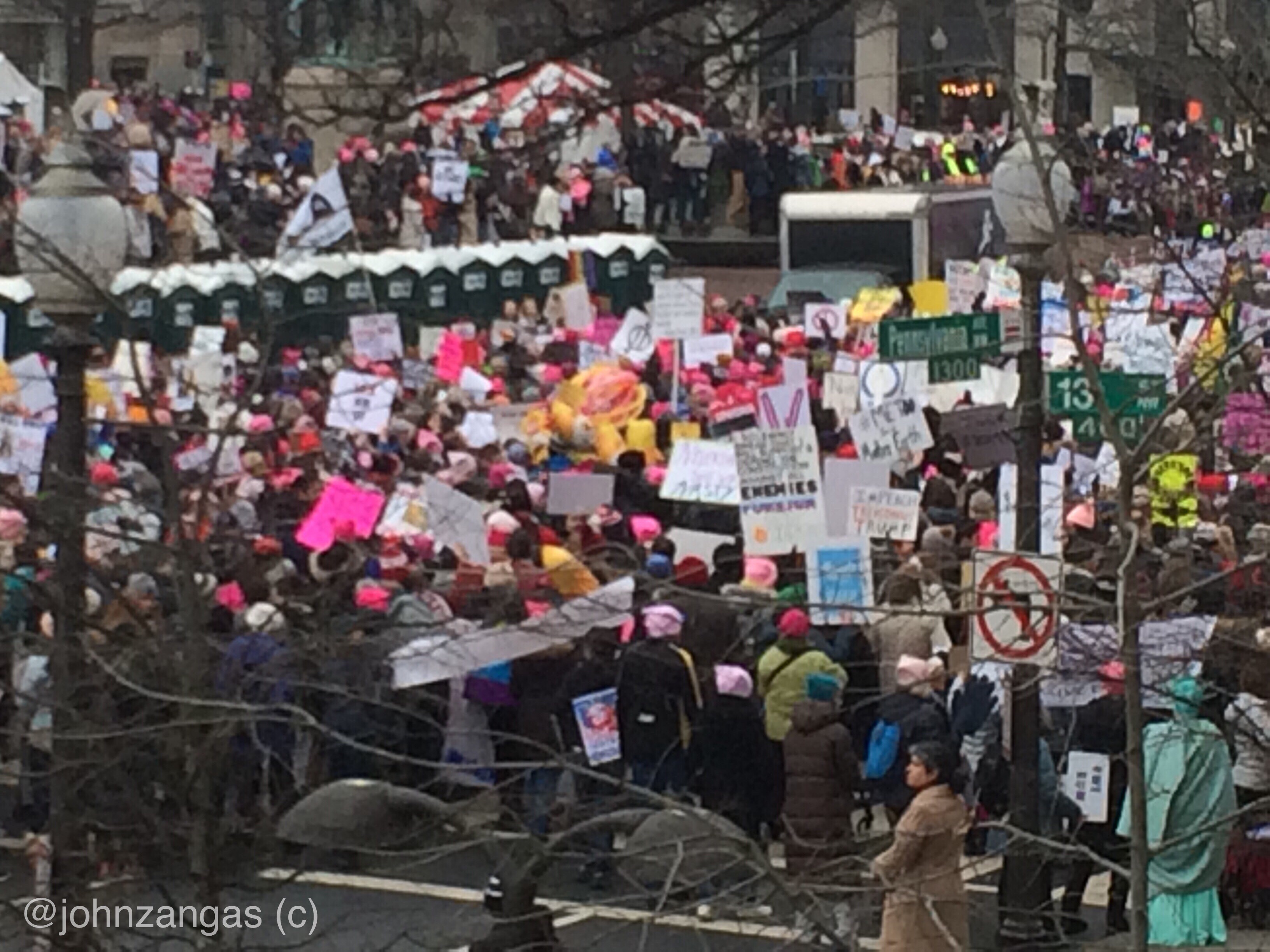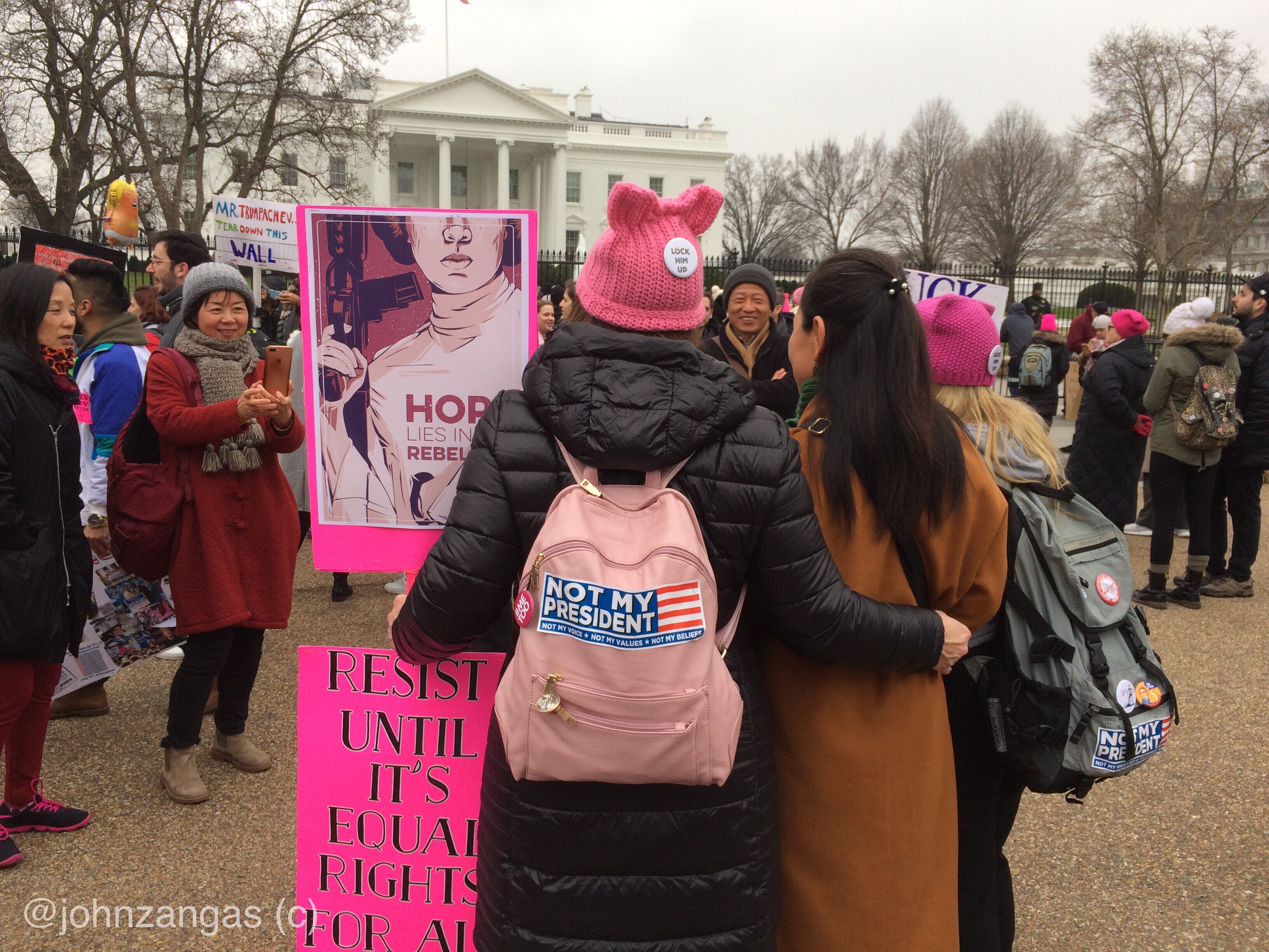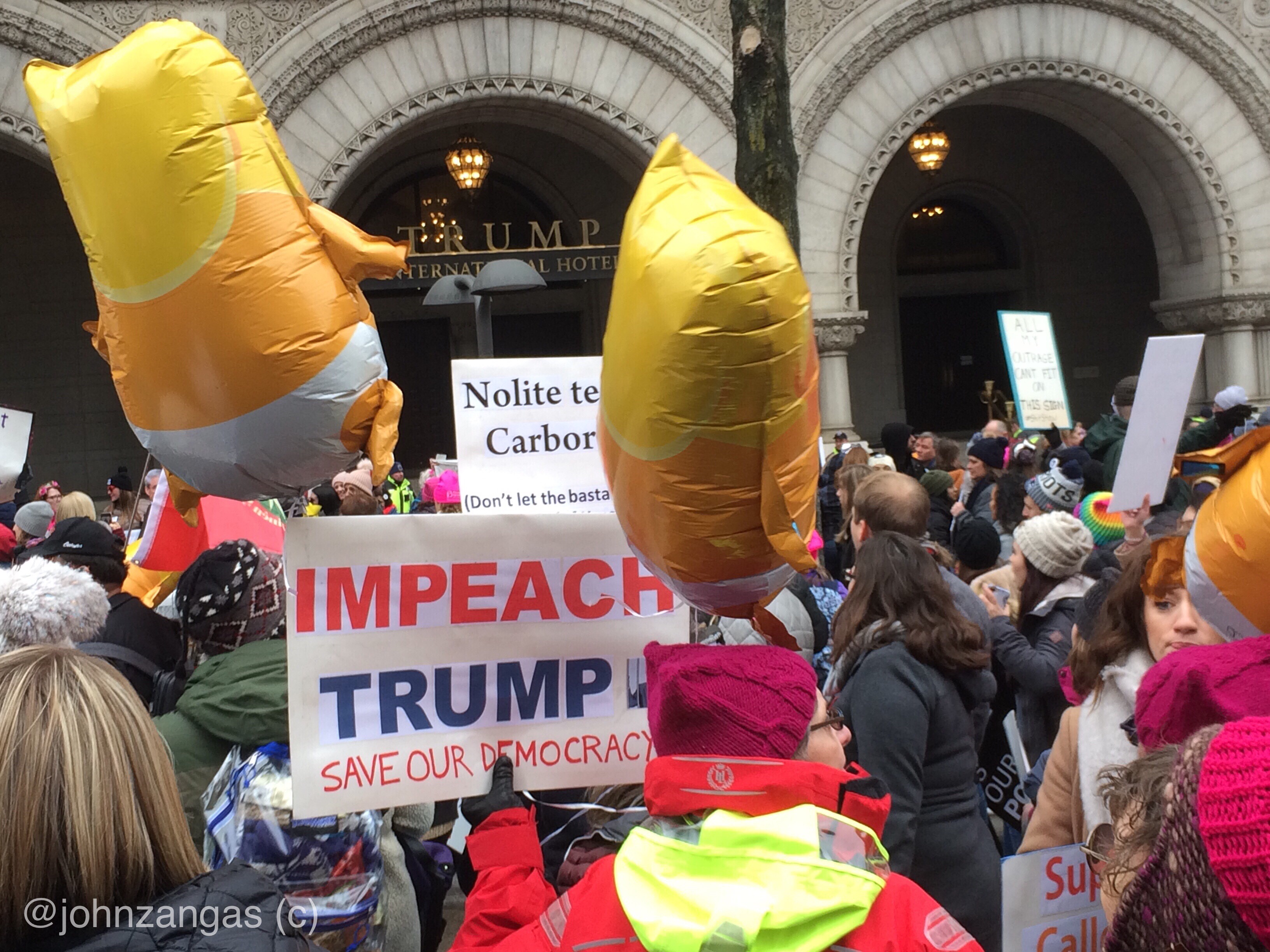 After speeches at Freedom Plaza, tens of thousands marched on a circuit past Trump International Hotel where lines of police blocked access to the edifice. Many lingered, expressing anger and chanting slogans. Others peeled off and left their signs at the gates of the White House as they had done the previous two years.
