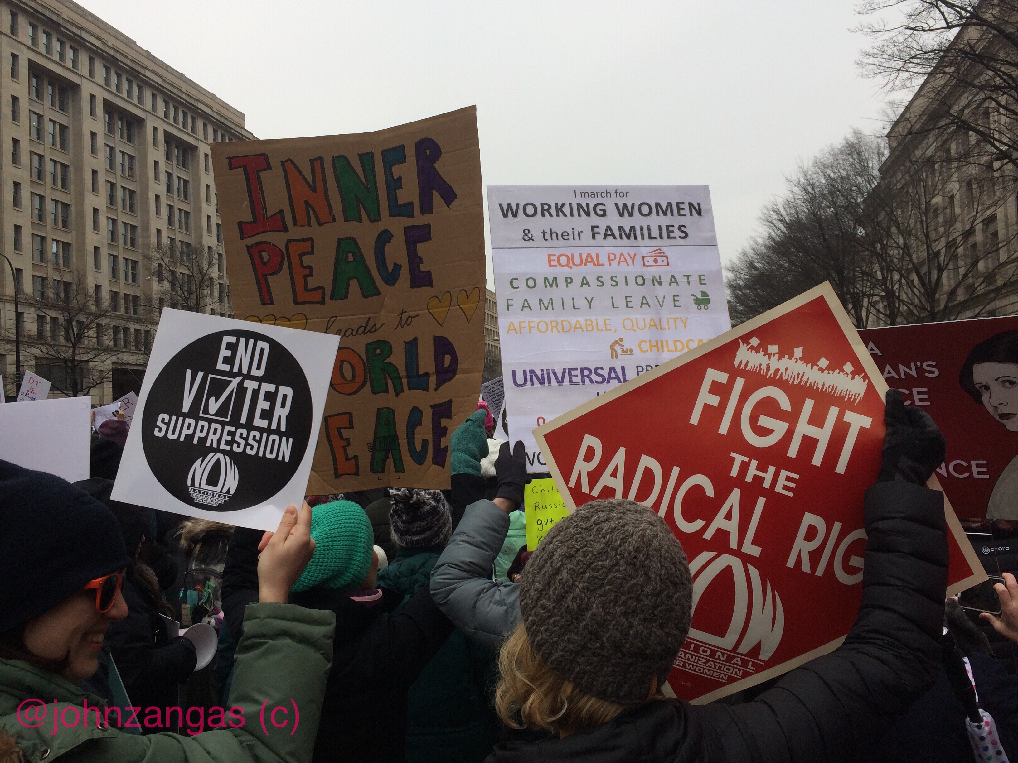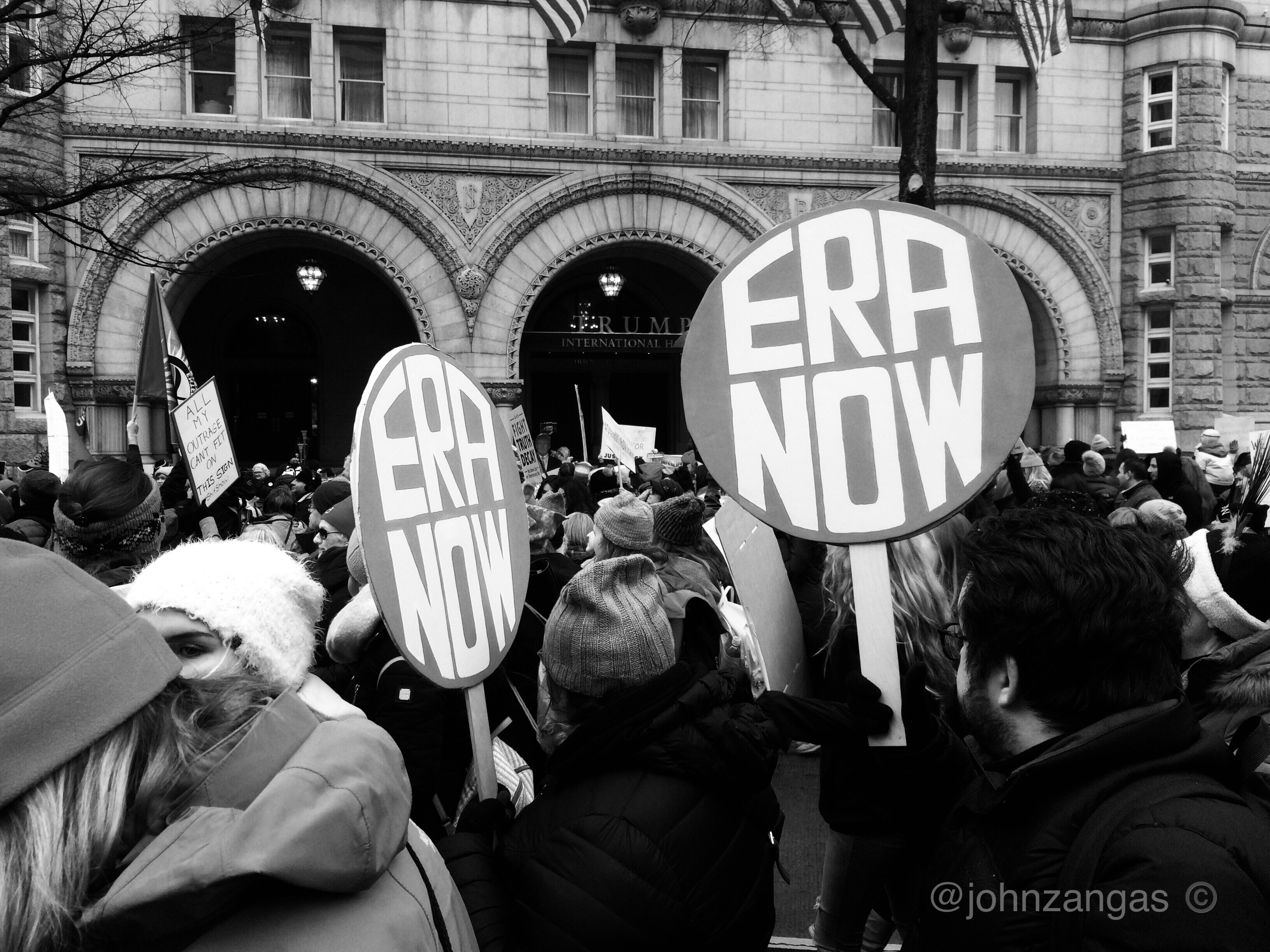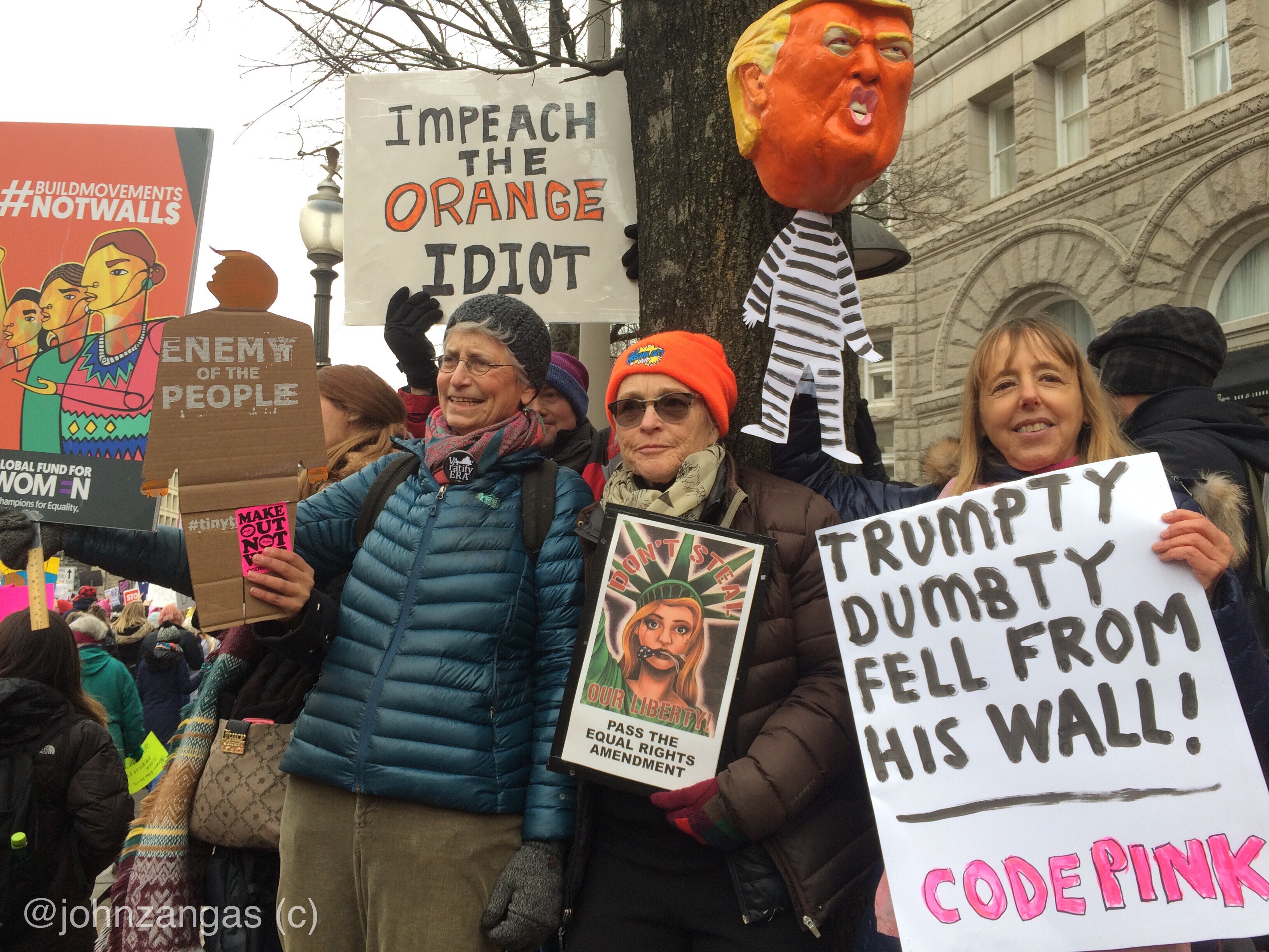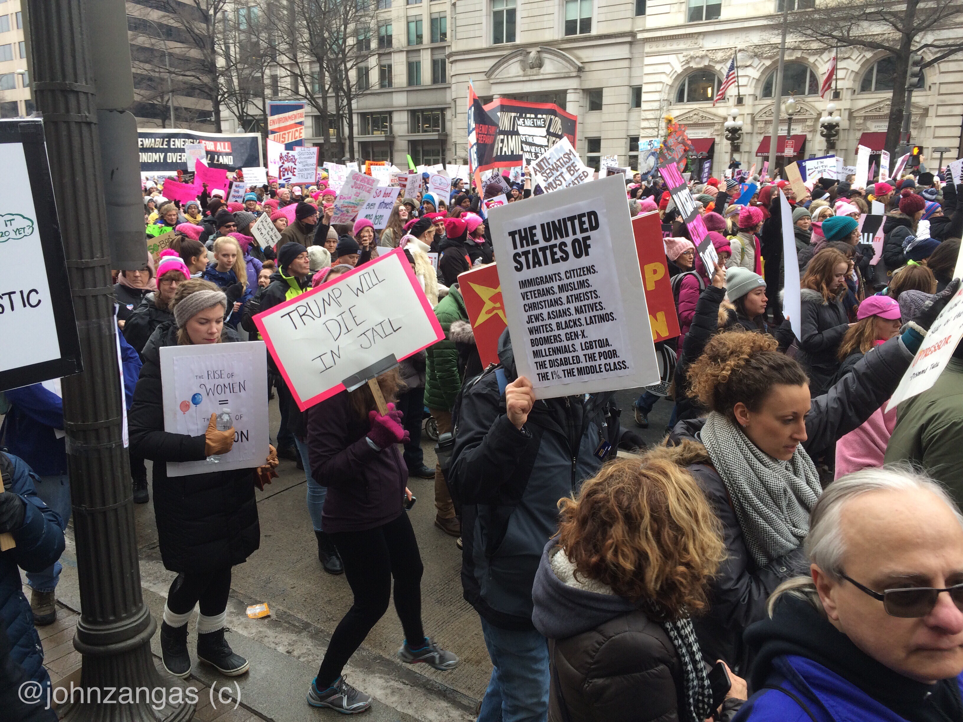 After speeches at Freedom Plaza, tens of thousands marched on a circuit past Trump International Hotel where lines of police blocked access to the edifice. Many lingered, expressing anger and chanting slogans. Others peeled off and left their signs at the gates of the White House as they had done the previous two years.