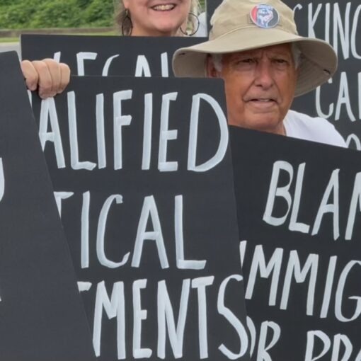 The banner and signs bespoke the obvious reasons for the civil disobedience. Veterans Benefits are being delayed because all throughout the Department of Veterans Affairs, doctors and staff are being cut. Veterans are also concerned about the Presidential activation of National Guard troops onto Los Angeles streets for an emergency created by the President’s own deployment of ICE there. ICE is rounding up thousands of migrants and green card holders and the central cause of chaos in cities throughout the U.S.