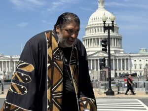 The towering civil rights leader was dressed in jet black, reflecting the solemnity of the moment, except for his vestment, gold and brown, with black and white cloth. As he spoke from the Supreme Court sidewalk, a single vocalist sang “Walk With Me, Lord.”