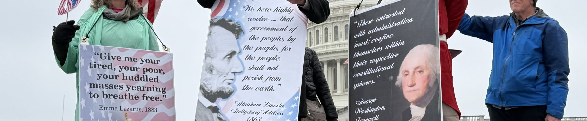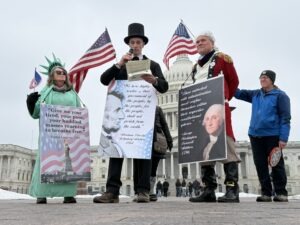 Washington DC—On Monday afternoon, a grassroots theater group from Third Act DC, Maryland and Virginia, presented selected speeches of the founding fathers outside the Capitol on President’s Day. The one-act play was free and open to the public and drew a small crowd of admirers on the chilly overcast holiday. Few tourists were visiting the Capitol as tourism in Washington DC has effectively collapsed to near covid levels not seen since 2020, during Trump’s first term.