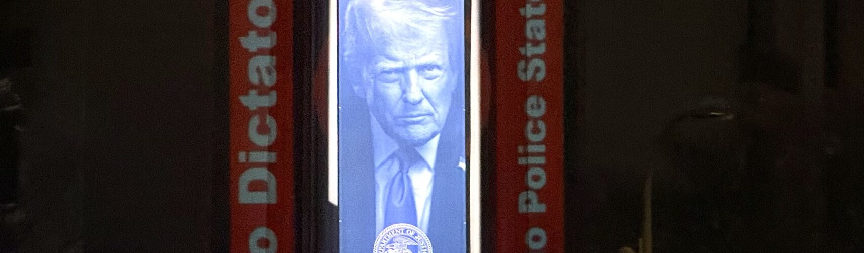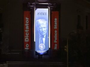 The slides framed the giant banner of Trump’s image which hangs from the recessed facade of the DoJ which appears similar to the ‘Big Brother’ caricature in the book 1984.. The slide show ran for about an hour over the banner which appeared to measure 15 feet wide and 30 feet long. The distance from the projector to the banner stretched the limits of the light projection luminance—set about 400 feet from the facade.
